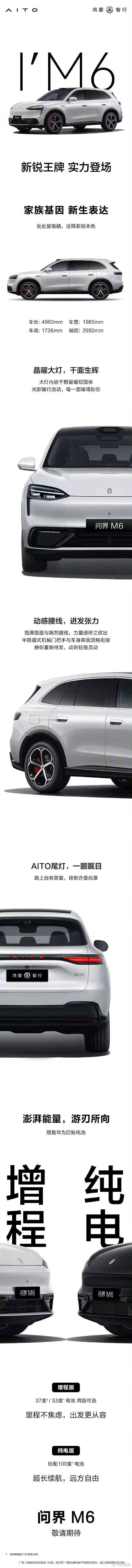 问界m6黑武士版曝光了,工信部新车公示中,问界M6也在其中,并曝光了黑武士版配色,提供增程和纯电两种版本!不得不说这个黑武士版的配色真的霸气,期待到时候看看真车如何!问界M6工信部公示问界M6黑武士版曝光