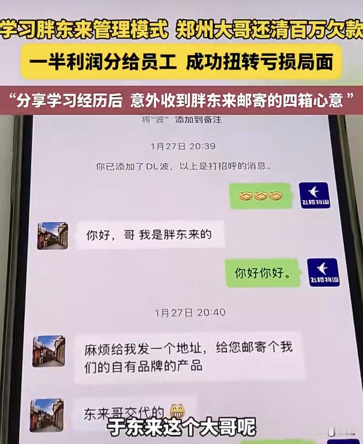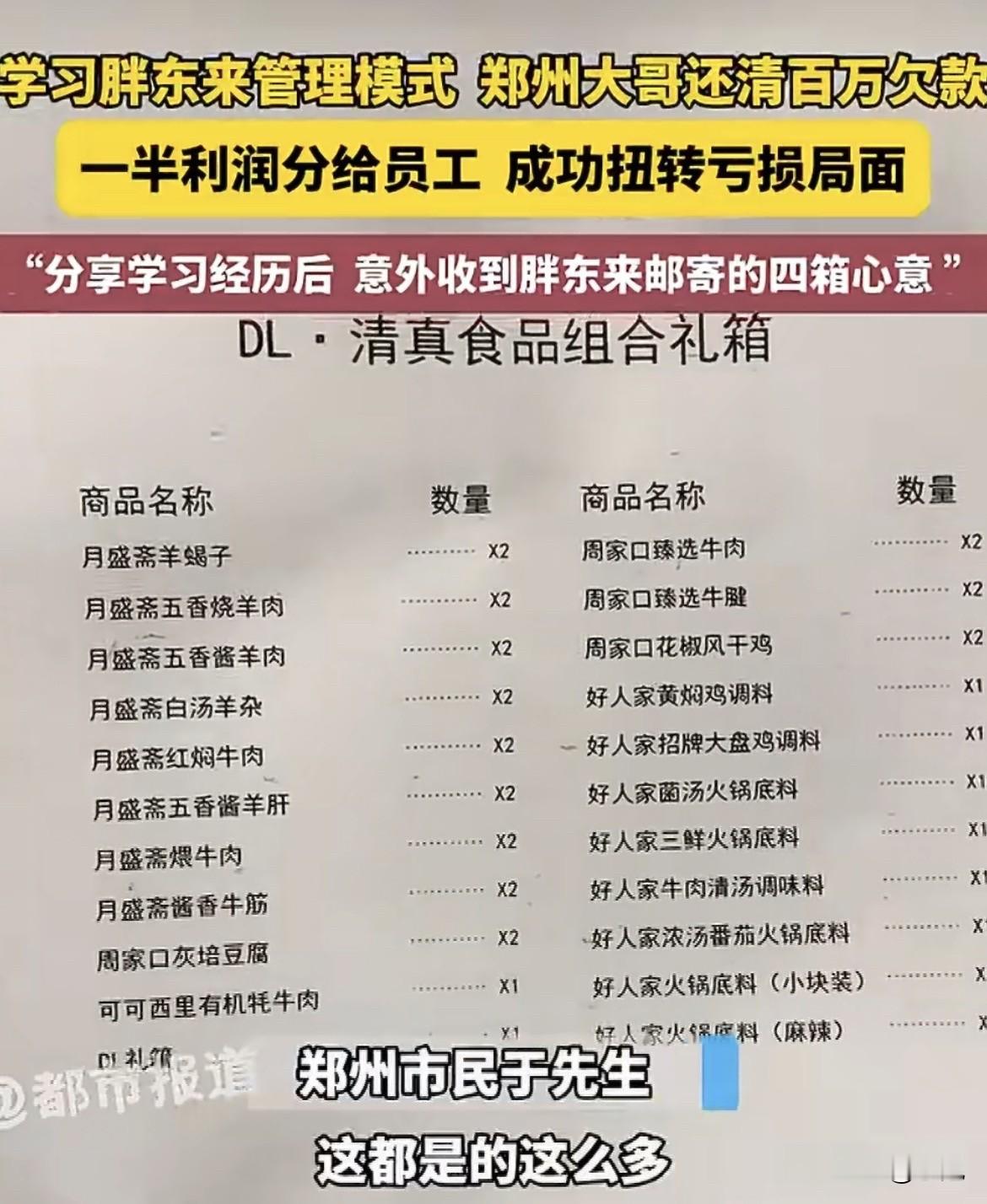 一位男子欠下105万外债,两次走到河边想轻生。他最早是货拉拉司机,每月挣5000元,后来创业干物流背上了这笔巨债。 人生的转机来自两次逛街。他逛了胖东来,被那里的经营理念触动了。回去后,他做了一件很多老板想都不敢想的事:把公司利润的50%分给员工,不打卡不考勤,只要完成工作甚至可以不到岗。 结果员工积极性肉眼可见地提高,公司利润节节攀升。他不仅还清了105万债务,还攒下了一些身家。更让他惊喜的是,他通过朋友联系上胖东来创始人于东来,分享了自己的经历后,竟然收到了胖东来寄来的满满四大箱礼物。 这个故事听起来像个奇迹,但胖东来的“商业机密”早就公开了。2025年3月,胖东来甚至把销售数据、管理制度这些核心信息都在网上公开了,就像企业“裸奔”。 于东来多次在抖音分享企业经营数据,他说要做“玻璃般透明的企业”。在胖东来,商品价签上直接标着进货价和毛利率,一件进货价498.7元的羽绒服只卖499元,利润就三毛钱。 但问题来了,为什么这么多老板知道胖东来的方法,却不愿意学呢? 看看永辉超市的例子就明白了。2025年3月,在中国超市周活动上,永辉高管在台上讲学习胖东来的成果,说郑州一家调改店月赚200万。于东来突然上台质问:“月赚200万为何不涨工资?”他直接说:“把60%-70%利润分给员工,比任何口号都管用。” 这句话撕开了传统商超的遮羞布。胖东来在许昌,员工平均月薪能到9886元,店长月薪甚至高达7.8万。而很多企业还陷在“先盈利后分配”的逻辑里,管理层说:“我们也想涨薪,但首先要保证企业活下去。” 那个还清外债的男子,学的就是胖东来“先分配后盈利”的逻辑。他可能不知道,于东来自己也有过类似的绝望时刻。于东来曾因倒卖假烟被罚,欠债30万,从里面出来回到许昌那天,在火车站对天说:如果能让我还完债,还我自由,我做牛做马都行! 后来于东来开了新店,在90年代假货横行的时候,他坚持“如假包换”,卖烟酒假一赔十,第一年就赚了90万。他说过:“真心对人好就是最大的捷径。” 现在胖东来有多成功?2024年销售额169.64亿元,利润超8亿元。2025年更猛,到11月销售额就突破200亿,超过2024年全年。它在许昌的超市,被网友称为“没有淡季的6A级景区”。 胖东来帮扶其他企业也很实在。2023年,它帮扶江西上饶的嘉百乐超市,那家企业当时几乎“死透了”,像个空壳公司。调改9个月后,日均销售额稳定在30万元以上,翻了一倍。 但学习胖东来,真不是简单照搬。有家超市学了胖东来的保洁流程,结果把员工都干跑了。于东来说得很直白:月入一千八,能干都不赖了。 那个还清105万外债的男子,算是学到了精髓。他不是简单地模仿形式,而是抓住了核心理念——对员工好,员工才会对顾客好。 现在胖东来甚至对来学习的企业设置门槛,两天交流活动每人收费100万,三小时私密分享50万。有人说这是胖东来变自私了,也有人说这是筛选真正想学习的人。 回过头看,那个男子的逆袭也许没那么复杂。他就是做了一件很简单的事:把赚来的钱分一半给帮他赚钱的人。听起来天经地义,可为什么那么多企业就是做不到呢? 于东来常说:“企业年赚200万就该满足,剩下的钱应该分给员工。” 这话让很多老板听着刺耳,但那个还清105万债的男子用实际行动证明,这话真的管用。 如果你是老板,你愿意把公司一半利润分给员工吗?你觉得这个男子的成功可以复制吗?