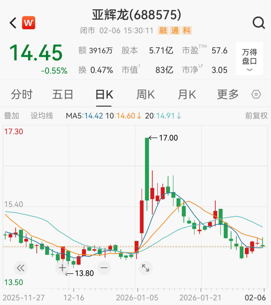 截至2月6日收盘,亚辉龙日内跌0.55%,股价报14.45元/股,最新市值为83亿元,最新股东户数为1.28万户。