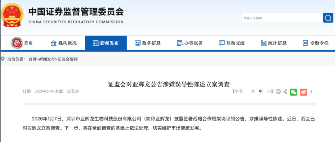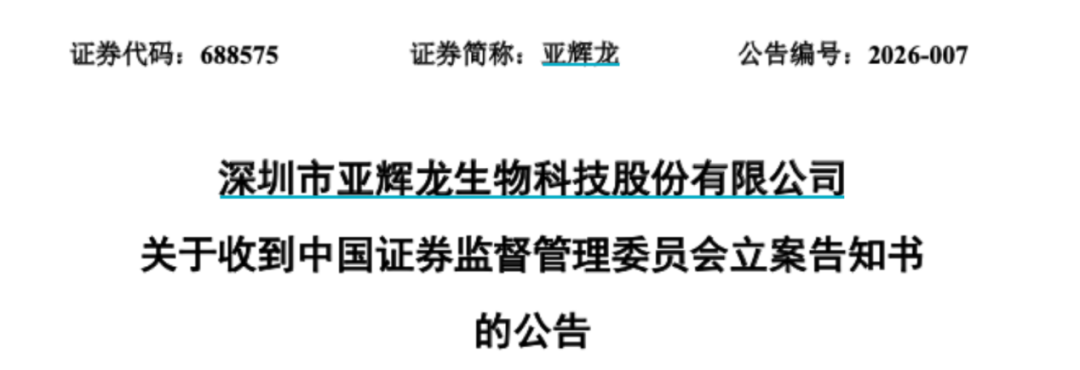 亚辉龙当晚发布公告称,公司已于2026年2月6日收到中国证监会下发的《立案告知书》,因公司涉嫌信息披露违法违规,中国证监会决定对公司立案。