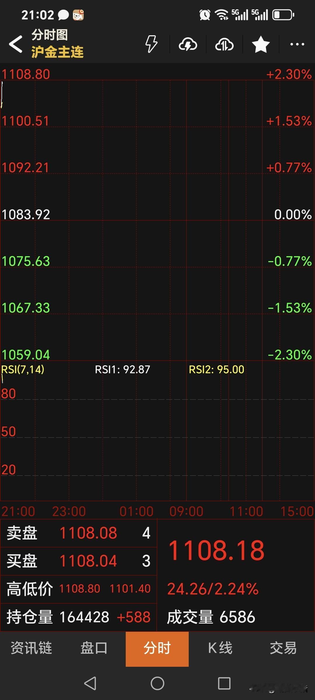 夜盘, 国内黄金期货 如期高开,符合判断。 主力合约开盘1104元, 高开20.08元。 现在报价1108.18元, 上涨24.26元。 对于黄金期货, 期货小褚还是 认为关注1160压力情况!
