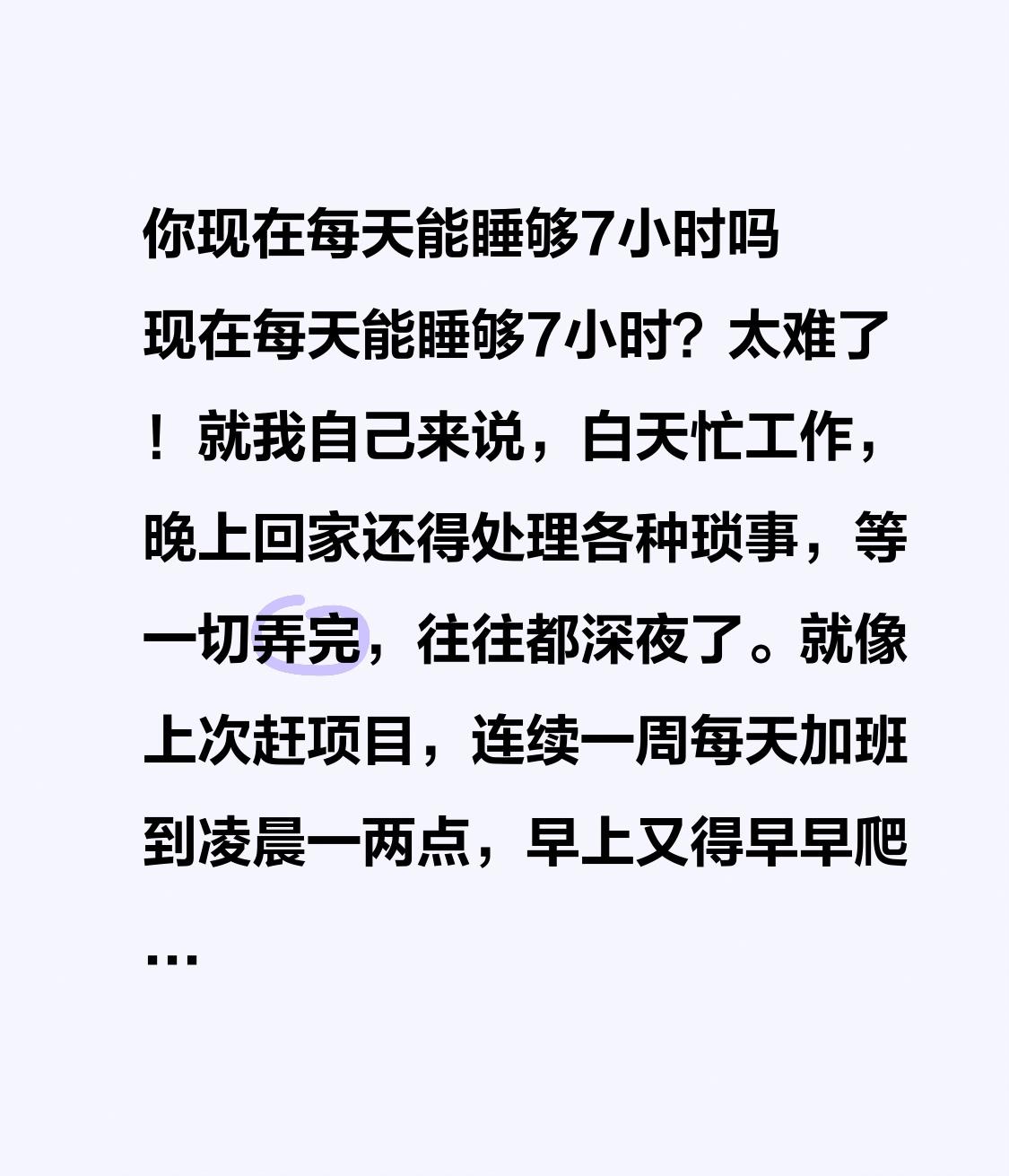 你现在每天能睡够7小时吗 现在每天能睡够7小时?太难了!就我自己来说,白天忙工作,晚上回家还得处理各种琐事,等一切弄完,往往都深夜了。 就像上次赶项目,连续一周每天加班到凌晨一两点,早上又得早早爬起来上班,每天睡眠时间也就四五个小时。那些说能轻松睡够7小时的人,真让人羡慕。长期睡眠不足,我明显感觉精神状态差,注意力不集中。 真希望能有更多时间好好睡一觉,补足这欠下的“睡眠债”。