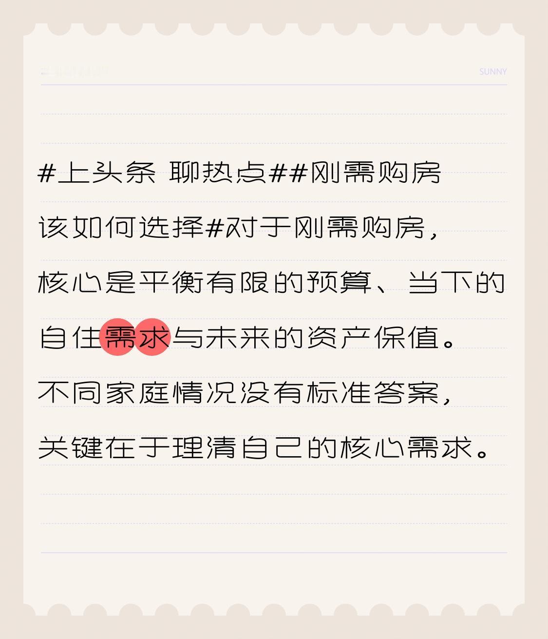同时,城市的发展方向也不容忽视——新区配套虽不成熟,但若有明确规划与人口流入,可能具备更大升值空间;而核心城区房源虽保值性强,但价格高企,需权衡性价比。此外,还需关注房屋的流通性,避免陷入“买得起、卖不掉”的困境。建议刚需家庭先列明“必要条件”与“可妥协项”,结合五年内的生活规划做出决策。购房不是一步到位的终点,而是阶段性最优选择,保持财务弹性与未来调整空间,往往比追求完美更重要。 总结来说,刚需购房无需追求完美。最重要的是根据你未来5-10年的生活重心来排序,在预算内优先满足最核心的几项需求。