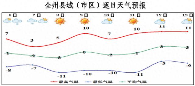 未来一周6~7日全州有降雪降温吹风天气,其余时段晴或多云。具体预报:6日9:00~20:00全州晴间多云;6日20:00~7日10:00全州阴有小雪,降雪量0.0~2.0毫米,积雪深度0~2厘米,最高气温下降3~5℃,全州大部偏北风4~6级,海拔较高山区部分乡镇阵风7级;7日10:00~13日20:00全州晴或多云。周内全州气温起伏较大,最高气温在3℃~11℃之间波动,最低气温-11℃~-5℃。