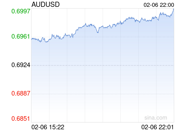 新浪外汇消息2026年02月06日,截至22时00分,外汇市场上澳元兑美元汇率突破1澳元兑换0.6996美元。涨幅为1.0399%