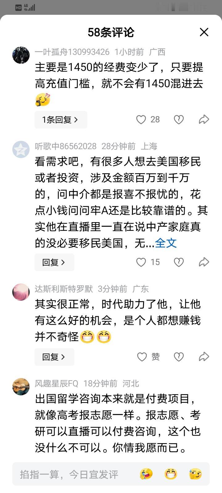 1450又发力了!眼看驳倒牢A的斩杀线无望,就拿学历、人品说事,现在又带节奏说人家割韭菜!其实说到底目的无非就是想解构牢a的“斩杀线”说,否定他说的那些关于美国的负面消息! 可现在是网络时代,随着社媒平台崛起,各国网友对账交换信息,已经突破了传统媒体制造的信息茧房,所以没那么好忽悠了。 看到牢a开通了付费问答服务,就带节奏质疑人家借话题热度割韭菜。知识付费本来是凭本事吃饭,这有什么好指摘的?譬如你去做心理咨询,法律咨询、情感咨询、高考志愿填报咨询、留学咨询等等人家不也要收费吗?轮到牢a用平台的玩法进行收费怎么就不行了呢? 再说这是你情我愿的事,有些人想到美国做投资或者留学,涉及的金额高达数十万、几千万不等,有些中介只报喜不报忧,花点小钱问牢a说不定更靠谱呢!各得其所,有什么不好呢? 信息是有价值的,时间也是有价值的。人家花时间专门回答你的问题,告诉你有效信息、帮你解答留学、学习、生活、婚恋避雷等问题及其注意事项,你付费回报不正常吗? 更不必说有些人自发给牢a打赏了,像这两天刷到有博主称牢a其中一条视频打赏过百万。我也很好奇,结果点进去一看,原来是这么回事。那博主举身边例子说某独生女嚷嚷着要去美国留学,父母一时劝阻不了,但是又没有什么充分理由说服女儿,一时僵持不下,如果决定去留学就要卖房凑钱,预计开销要几百万,后来牢a出了这期视频后,朋友夫妇看了又拿给女儿看,最后女儿放弃留学念想,夫妇两人感激牢a转头给他打赏了1万块,类似的例子比比皆是,打赏过百万就是这么来的。对这些急需解决问题的人来说,牢a的祛魅言论算是大功一件了。 牢A直播