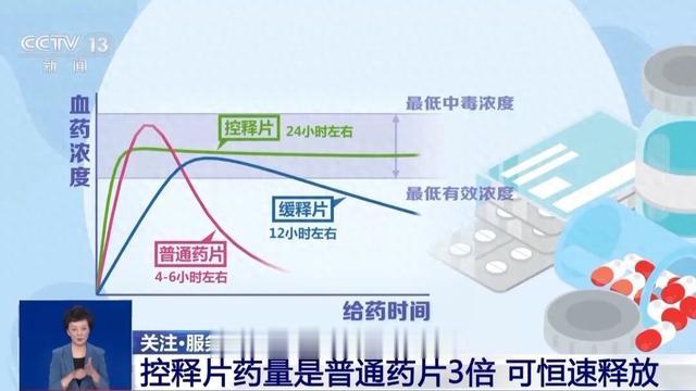 普通药片的药物起效、吸收和消失的速度通常在4—6小时左右,患者24小时内需要服药3次,而控释片可以恒速释放药量,它的药量是普通药片的3倍,患者一天仅需服用一次,药效在体内恒速释放24小时左右。
