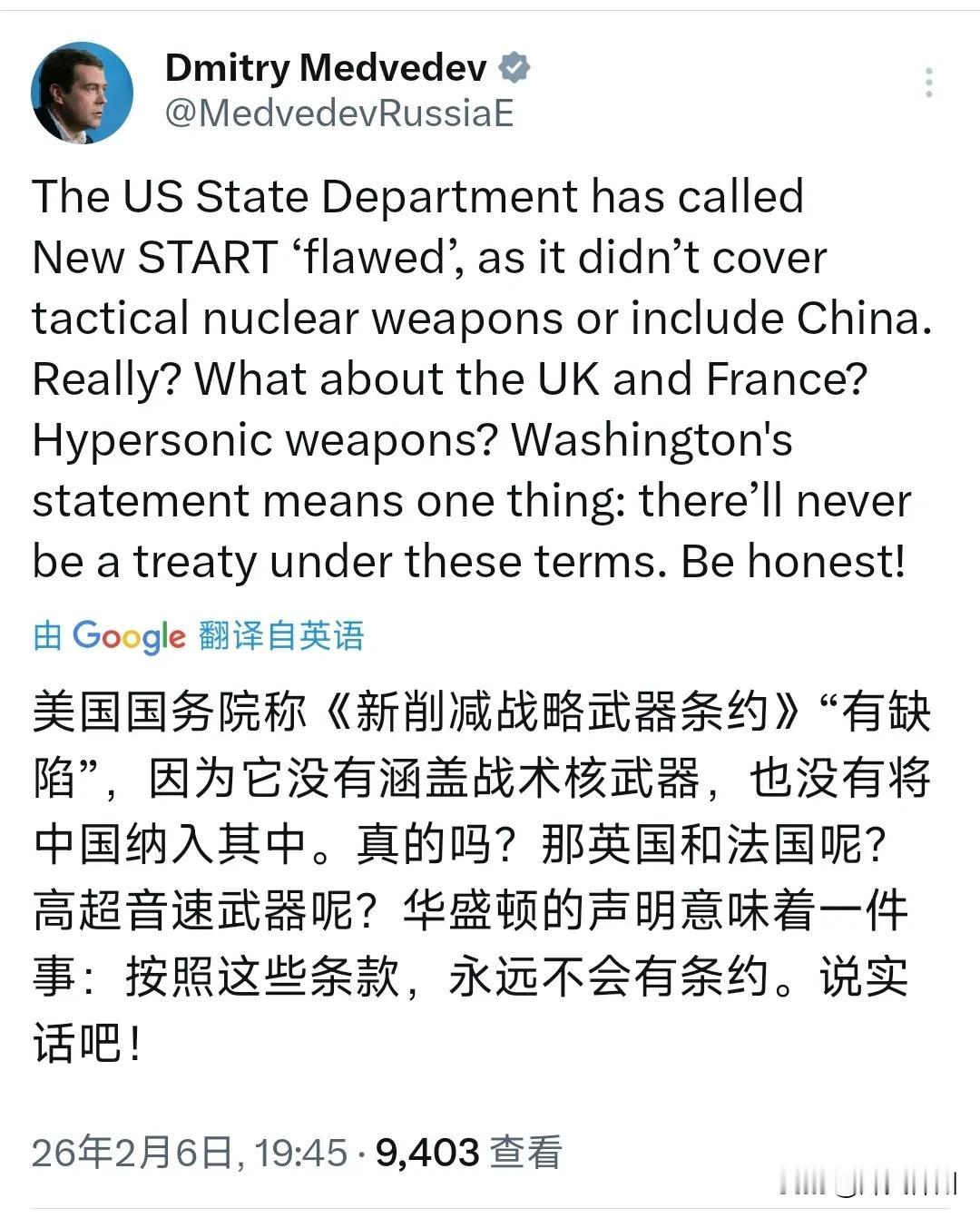 梅德韦杰夫今晚(北京时间2月6日晚)写道:“美国国务院称《新削减战略武器条约》‘有缺陷’,因为它没有涵盖战术核武器,也没有将中国纳入其中。真的吗?那英国和法国呢?高超音速武器呢?华盛顿的声明意味着一件事:按照这些条款,永远不会有条约。说实话吧! 评几句: 美方给《新削减战略武器条约》做“缺陷”的定性,扯着战术核武、未纳中国说事,梅德韦杰夫的灵魂拷问,直接戳穿美方的虚伪! 谈条约缺陷却对英、法核力量视而不见,盯着中国喊不公,却对高超音速武器避而不谈,这般选择性失明,说到底就是揣着明白装糊涂! 全球最后一份核军控条约行将失效,俄方一再提议延约表诚意,美方却忙着找各种借口挑刺,不是条约有缺陷,是美方根本不想谈! 一边手握全球最大核武库固守霸权,一边拒不履行核裁军首要责任,反倒靠制造借口破坏军控体系,美方的小心思,早已昭然若揭! 真有心维护核军控,就别搞双重标准、别玩话术套路!这般毫无诚意的操作,不过是为核军备竞赛找理由,终究只会让全球安全防线越晃越松!