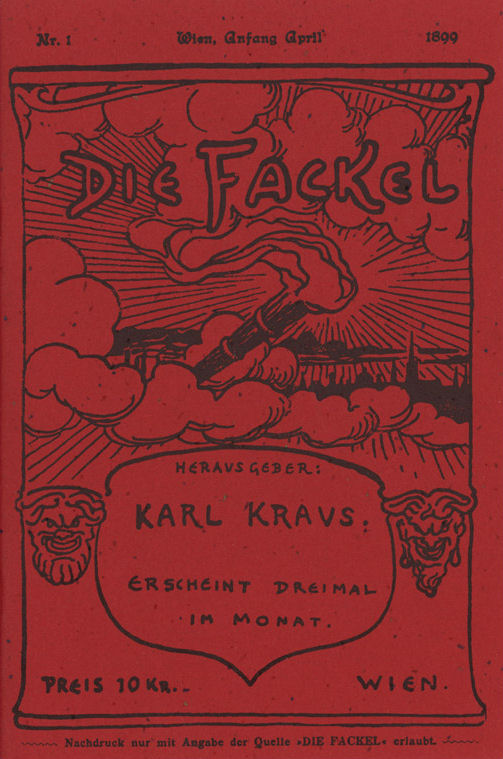“作家”一词在当代德语中的对应词是Schriftsteller,按字面可以拆分成Schrift和Steller两个词,直译为“把字摆在一起的人”或者“写作者”。对卡尔·克劳斯而言,“写作者”这个职业标签更合适些。他眼中的文学,是语言的艺术,是诗歌,是戏剧,是形式短小而凝练、字少意深的随笔,而小说被他排除在文学之外。他的文字写作始于戏剧评论、讽刺专栏文章,并得到主流报刊的认可。1899年,他创立自己的期刊《火炬》(Fackel),刚开始还接受外稿,不久后变成由他独自承担从写作到编辑的全部工作,直到1936年停刊,总共出版922期,合计22600页,高峰时期的发行量达38000册。他是媒体人,是文学创作者、文化艺术批评者,也是社会政治变迁进程的犀利观察者、尖锐批判者。一些后来活跃在思想界的知名人物都曾经是他的忠实读者,都是在《火炬》的陪伴下成长起来的,比如本雅明、维特根斯坦、卡内蒂、阿多诺以及布莱希特。