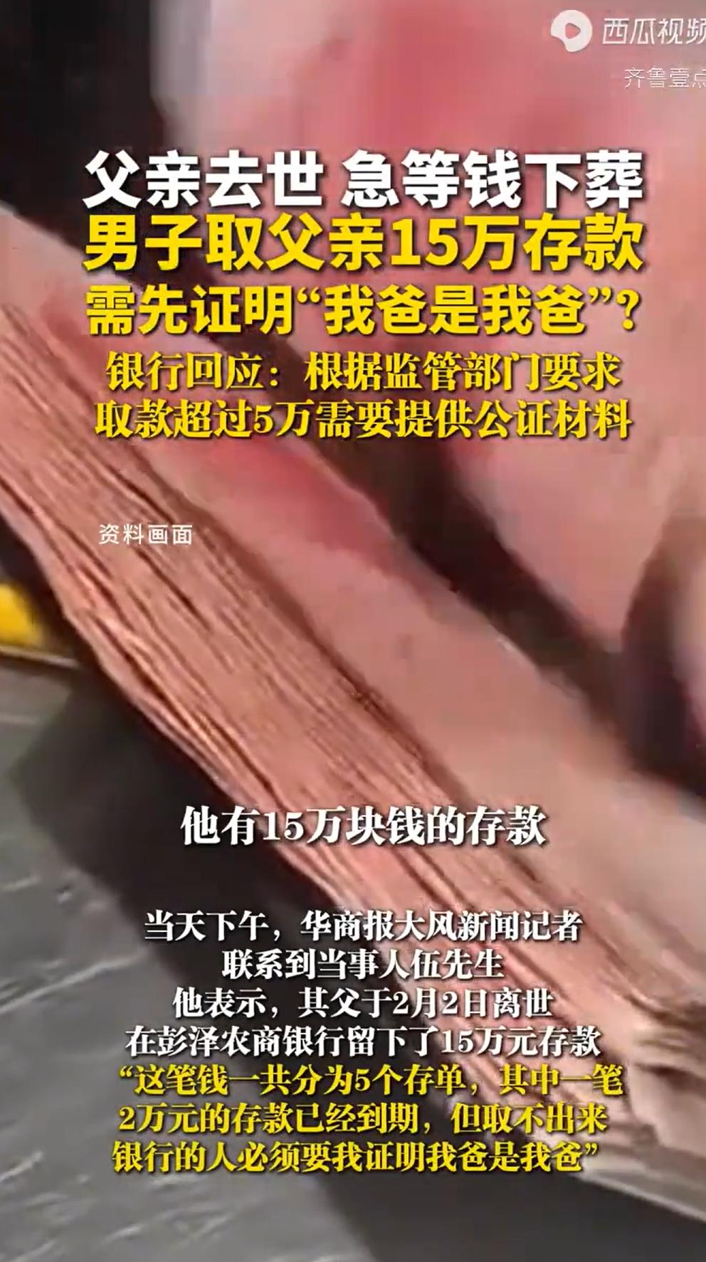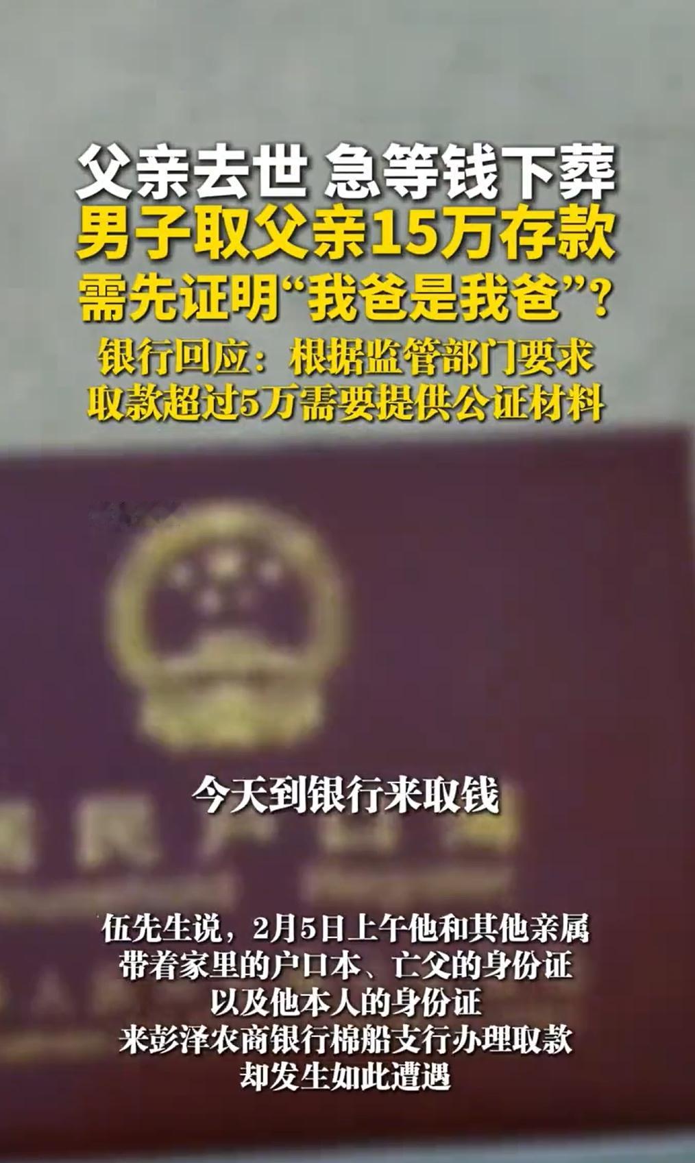 江西九江,一男子的父亲刚去世,等着钱料理丧事,男子拿着存单、户口本、身份证去镇上银行柜台取父亲生前留下的15万存款。不料,柜员翻了翻存单,摇头说不行,想拿钱,得先去公证处办继承权证明。男子愣了:“户口本上我是他儿子,还要怎么证明我爸是我爸?”银行也很坚持:这是规矩。五万以下可以商量,超过五万就是大额,必须看到公证书才能付款,不然付错了人,担不起责任。一边是等钱入土为安的人伦急事,一边是纹丝不动的银行铁规,僵持不下。   据悉,2月2日,伍先生的父亲因病离世,留下了一个亟待料理的后事,和一份总额十五万元的银行存款。   这钱,分存在五张存单里,是父亲省吃俭用一辈子的积蓄,此刻也成了办理丧事、安抚生者的重要依托。   伍先生觉得,取这笔钱应当是当下最直接、也最不难办到的一件事。   2月5日上午,伍先生召集了几位近亲,仔细清点好材料,父亲那已经失效但信息清晰的身份证、记载着全家户籍关系的户口本、以及他自己的身份证。   在他看来,这些证件白纸黑字,足以证明他与父亲之间的血脉联系与权利承继。   一行人怀揣着悲伤与些许急迫,走进了银行的营业大厅。   然而,当柜员得知存款人已故,且提取金额涉及数张存单、总额达到十五万元时,原本程式化的流程出现了停顿。   柜员向他耐心但坚持地解释,根据规定,提取已故存款人五万元以上的存款,属于“大额继承”,银行无法仅凭客户提供的户口本、身份证等直接办理,需要提供由公证机构出具的“继承权公证书”。   伍先生懵了,父亲等着入土为安,各项开销迫在眉睫,手头现有的证件明明写着父子关系,为何银行就是不认?   在他看来,银行的要求近乎荒谬,相当于要他“证明我爸是我爸”。   随后,伍先生将这段经历拍成视频发布在网上,一句“银行的人必须要我证明我爸是我爸,太荒唐了”,瞬间击中了无数网友的共鸣神经,质疑声浪随之而起。   面对舆论风波,涉事银行很快向媒体澄清,银行并非刻意刁难,要求出具“奇葩证明”。   银行的做法,是严格遵循监管部门对于储蓄存款继承过户的长期性规定。   但一旦超过五万元这个“大额”门槛,为了保障存款安全、审慎确认继承权归属、防范潜在的法律纠纷,银行必须要求继承人提供公证机构或法院出具的法律文书,方能办理支取或过户。   那么,从法律角度,这件事如何评判呢?   《关于查询、停止支付和没收个人在银行的存款以及存款人死亡后的存款过户或支付手续的联合通知》(银发〔1993〕7号)第二条第(一)项明确规定:存款人死亡后,合法继承人为证明自己的身份和有权提取该项存款,应向储蓄机构所在地的公证处申请办理继承权证明书,储蓄机构凭以办理过户或支付手续。该项存款的继承权发生争执时,由人民法院判处。储蓄机构凭人民法院的判决书、裁定书或调解书办理过户或支付手续。   该规定为银行业处理存款继承业务确立了公证(或诉讼)前置的基本原则。   结合《中国银保监会办公厅中国人民银行办公厅关于简化提取已故存款人小额存款相关事宜的通知》(银保监办发〔2021〕18号)及《关于优化已故存款人小额存款提取有关要求的通知》(金规【2024】6号)等规定。   如果已故存款人在同一法人银行业金融机构的账户余额合计不超过5万元人民币,继承人无需提交公证书就可一次性提取已故存款人存款及利息,而超过5万元,则仍需遵循上述规定要求。   具体到本案,伍先生父亲留下的存款总额为15万元,已远超5万元的小额简化标准,因此银行要求其办理公证,回归到一般法律程序,于规有据。   伍先生认为户口本足以证明“我爸是我爸”,从而有权取款。   然而,户口本通常只记载户籍关系,不能全面反映所有法定继承人。   《民法典》第一千一百二十七条  遗产按照下列顺序继承:(一)第一顺序:配偶、子女、父母;……   就本案而言,伍先生虽然是第一顺位继承人,但其只是合法继承人之一,不排除其还有其他兄弟姐妹、爷爷奶奶等第一顺位继承人,而其他继承人是否同意由他一人提取全部存款,难以证明。   银行如果仅凭户口本付款给伍先生,一旦其他合法继承人出现并主张权利,银行将陷入法律纠纷,面临重复支付的风险。   而继承权公证书或法院文书,是在公证员或法官主持下,对所有继承人身份、意思表示、有无遗嘱等情况进行全面调查、审核后出具的具有法律强制执行效力的文书,其权威性和完整性远非户口本可比。   所以,银行要求伍先生对超过5万元的大额存款提供继承权公证书,具有明确的法律法规和部门规章依据,是其履行审慎审核义务、控制金融法律风险的正当行为,并非无理刁难或索要“奇葩证明”。   对此,您怎么看?