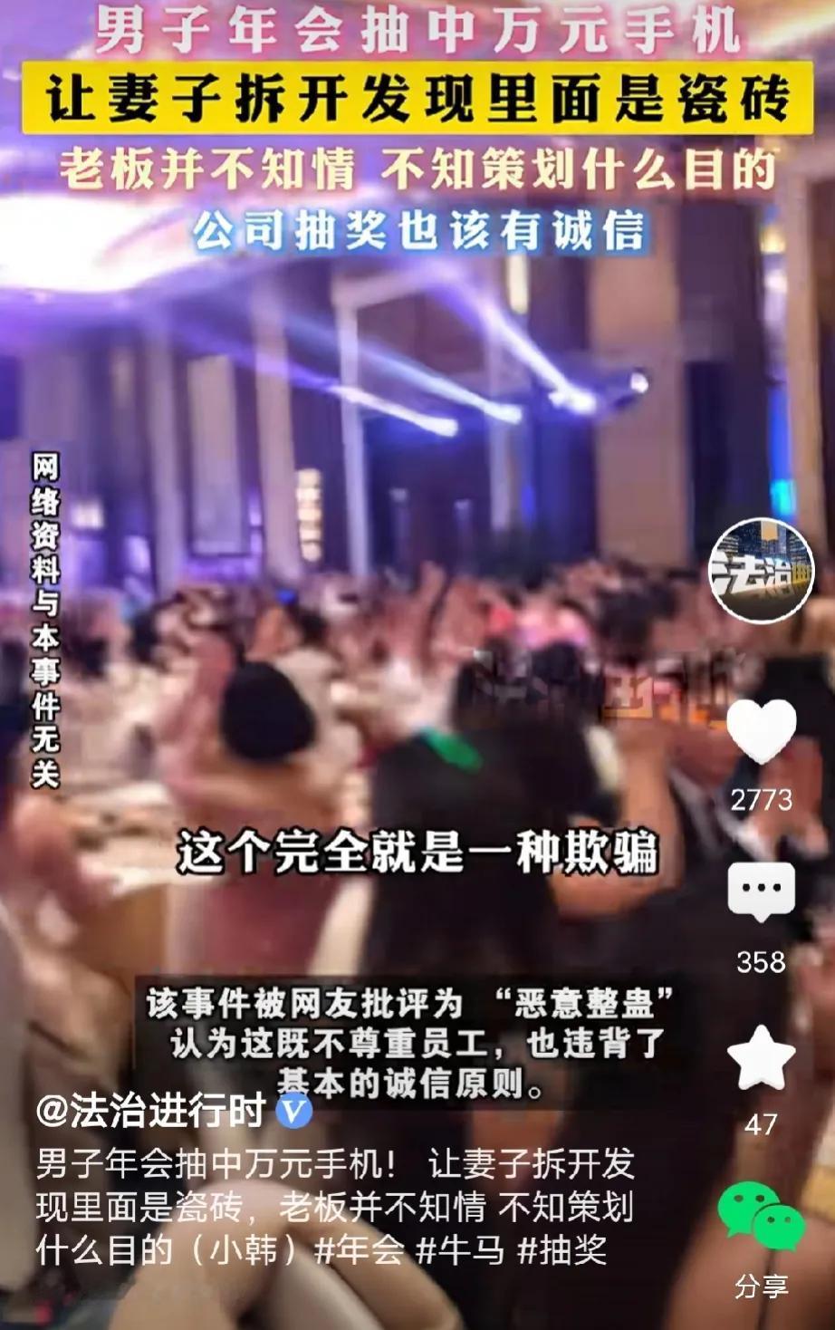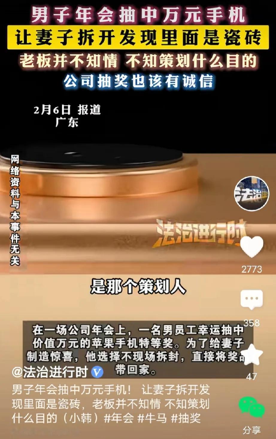 广东珠海,男子年会上抽中9988元苹果手机,开开心心带回家想给老婆惊喜,谁料,老婆一打开,里面躺的不是手机而是两块石砖,男子气愤不已,赶紧找公司讨说法。事后,科室主任声称为活跃气氛才这么做,老板并不知情。男子直言:手机可以不要,但得公开道歉。网友:差点就落入科室主任手里。 2月5号晚上,江某兴冲冲赶到公司年会现场,推杯换盏间,所有人都盯着舞台上的抽奖大屏,特等奖9988元的苹果手机,是全场所有人的期待。 江某本没抱太大希望,拿着酒杯悠哉悠哉地跟着工友边喝酒边聊天。 谁料,主持人突然念出他的名字,宣布他是特等奖获得者。 江某以为自己听错了,愣了一下,才不可置信地看向舞台。 接着工友们纷纷拍手起哄,叫他赶紧上去领奖,江某才反应过来,自己真的中奖了。 看着工友们投来羡慕的眼光,江某心里乐开了花,他三步并作两步很快走到舞台上。 特等奖是老板亲自发给他的,当他接过那沉甸甸的幸运礼盒,心里感到无比幸福。 回到座位后,同一桌子的同事纷纷起哄让江某赶紧打开看看里面的手机,可江某却摆摆手说,这手机我要送给我老婆,回家了让她亲自拆开这个惊喜。 同事们听了都开玩笑说,果然,爱妻者百财聚。 年会结束后江某赶紧带着手机赶回家,一路上他都在想着妻子拿到手机后,会是什么样的表情。 回到家后,江某神神秘秘地把礼盒递给妻子,妻子问他,那是什么? 江某没有直接回答而是说,你打开了会有惊喜。 没想到,妻子打开后直接暴跳如雷大声直呼他的名字:两块石砖,这就是你给我的惊喜,这石砖是金砖银砖吗? 江某一听赶紧冲过去一看,差点没气晕过去,躺在礼盒里的那哪是手机,分明是不值钱的石砖啊。 江某把情况跟老婆说后,两人都气愤不已,越想越气的江某,连夜就向公司负责人反映了这件事,要求给出一个合理的解释。 第二天,公司经过调查,结果出来了,负责策划年会的科室主任找到江某解释说,他为了活跃气氛,故意策划的“整蛊”还说整件事老板并不知情,都是他个人所为。 得知真相的江某怒不可遏,他直言自己生气的从来不是没拿到手机,而是这份被随意捉弄的不被尊重。 年会抽奖本是公司给员工的福利,却被当成了整蛊的噱头,自己满心欢喜想给老婆一个惊喜,最后却闹了一场笑话。 江某明确向公司表示:“这部手机我可以不要,但科室主任必须给我一个正式的公开道歉,为他这场没分寸的整蛊负责。” 这件事被发到网上后,网友们也纷纷为江某抱不平,有人直言,这哪是活跃气氛,分明是欺负人。 还有人调侃“还好没拆封,不然主任怕是直接把手机揣自己兜里了,差点就落入科室主任手里”。 目前,公司已介入协调,要求涉事主任向江某道歉,这场因整蛊引发的闹剧,也让不少人反思:职场里的玩笑,终究要守住尊重的底线。 那么,科室主任的行为是否构成欺诈? 《民法典》第148条规定,一方以欺诈手段,使对方在违背真实意思的情况下实施的民事法律行为,受欺诈方有权请求人民法院或者仲裁机构予以撤销。 民事欺诈的核心是故意隐瞒真相、虚构事实,诱使对方陷入错误认识并作出意思表示。 回到这个事件,公司举办年会抽奖并公示特等奖为苹果手机,江某因公司的抽奖规则产生获得奖品的合理期待,而科室主任故意调包奖品、隐瞒石砖真相,使江某陷入“已获得手机”的错误认识,属于典型的民事欺诈行为。 江某作为受欺诈方,有权请求撤销该抽奖获奖的民事法律行为,同时可依据此条向过错方主张赔礼道歉、赔偿精神损害等民事责任。