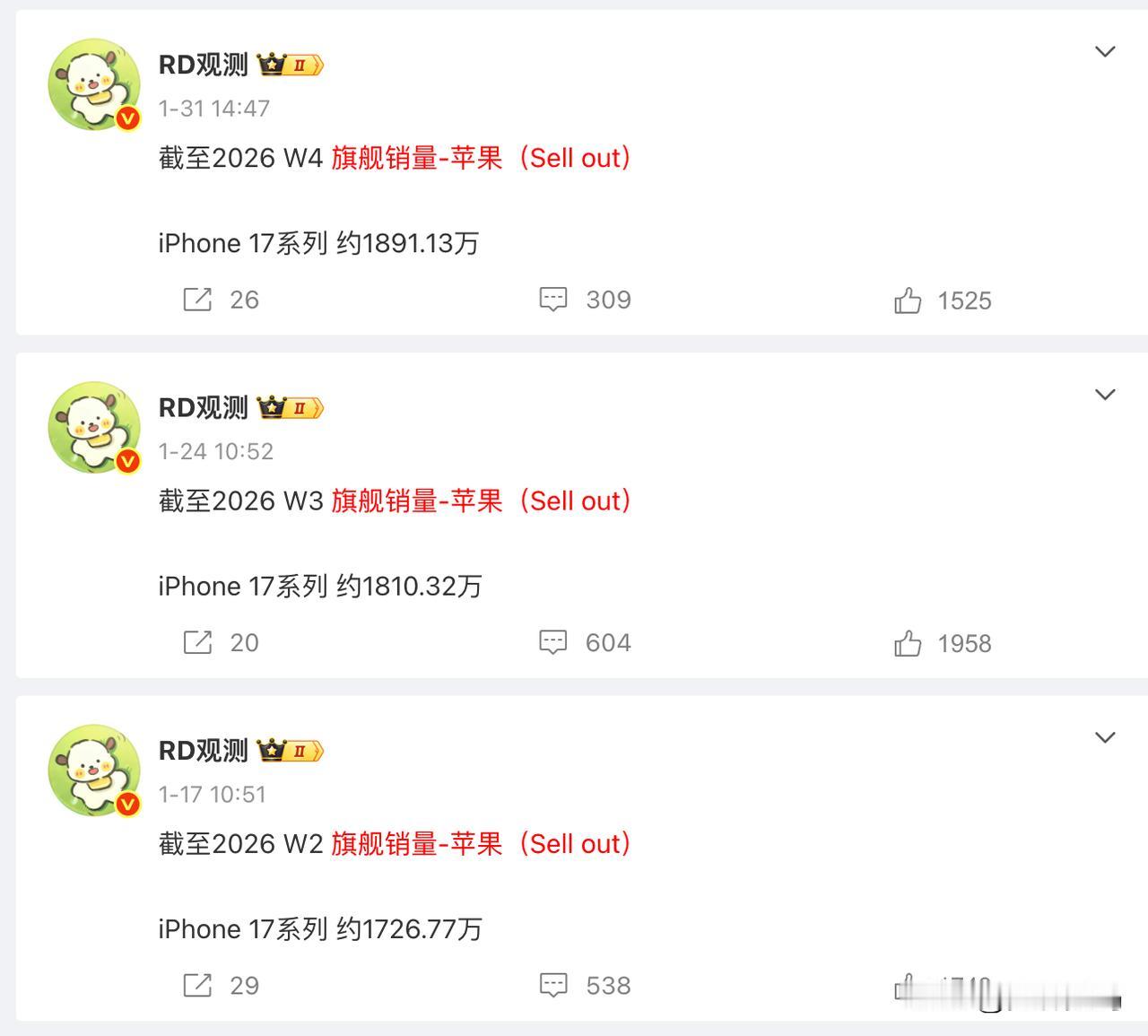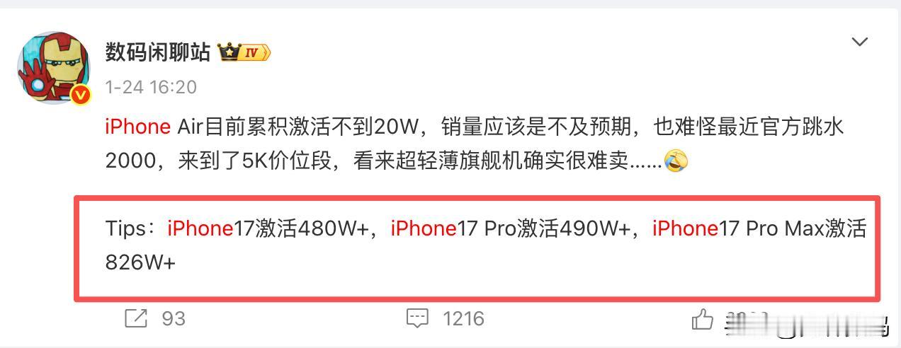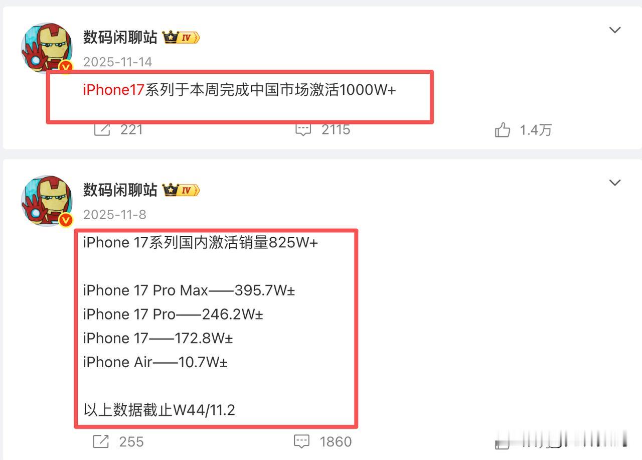 实在太恐怖了,iPhone17系列国内销量突破2000万,17ProMax成销量主力即将破1000万! 根据博主闲聊站的说法,iPhone17系列于本周完成了在国内激活2000万台的成绩,不得不说这是一个非常夸张的成绩。 要知道iPhone17系列9月19日才正式开售,满打满算也才141天,不足5个月的时间,在国内销量已经突破2000万了(11月中旬国内达成1000万销量,第一个1000万用时还不足两个月,而第二个1000万也就用了2个月多一点点时间,看来这个销量势头一点没减)。 照这个趋势下去,iPhone17系列不是在2026年底国内累计销量轻松突破5000万?(目前17系列月销量300万左右,18Pro系列9月份发布,但是iPhone18延迟了,就按9月算,那就是2400万,再加上中间618大促,标准版延迟发布,17系列在2026年怎么也能破3000万吧)。 并且更恐怖的是,这里面卖得最好的是最贵的iPhone17ProMax,本月底前应该能完成单品销量破千万的成绩。 毕竟之前战哥就说了,iPhone17激活480W+,iPhone17 Pro激活490W+,iPhone17 Pro Max激活826W+(合计1796万,iPhone17ProMax占比45.6%,差不多快要占一半了),这是1月下旬说的数据,按照这个趋势(一个周40万左右销量),我们就按2000万里ProMax占比45%,那么iPhone17ProMax目前都是的800万了,再来两个星期多一点基本上就能达标,确实很容易在本月就达到1000万销量。 并且17ProMax的均价达到11000,这真的太疯狂了(这意味着绝大多数人都是选择512G版本)。 换句话说,iPhone17系列销量大头是最贵的iPhone17ProMax,占比接近一半。并且iPhone17ProMax的的512G版本,不是都说大家没钱么?怎么消费力这么猛 ! 我整理了一下RD的苹果周销量: 截至2026 W4 旗舰销量-苹果(Sell out)——iPhone 17系列 约1891.13万【单周增长80.81万】 截至2026 W3 旗舰销量-苹果(Sell out)——iPhone 17系列 约1810.32万【单周增长83.55万】 截至2026 W2 旗舰销量-苹果(Sell out)——iPhone 17系列 约1726.77万【单周增长84.8万】 截至2026 W1 旗舰销量-苹果(Sell out)——iPhone 17系列 约1641.97万【单周增长84.7万】 截至2025 W52 旗舰销量-苹果(Sell out)——iPhone 17系列 约1557.27万【单周增长70.86万】 截至2025 W51 旗舰销量-苹果(Sell out)——iPhone 17系列 约1486.41万【单周增长74.84万】 截至2025 W50 旗舰销量-苹果(Sell out)——iPhone 17系列 约1411.57万【单周增长82.04万】 截至2025 W49 旗舰销量-苹果(Sell out)——iPhone 17系列 约1329.53万【单周增长74.23万】 截至2025 W48 旗舰销量-苹果(Sell out)——iPhone 17系列 约1255.3万【单周增长80.2万】 截至2025 W47 旗舰销量-苹果(Sell out)——iPhone 17系列 约1175.1万【单周增长98.4万】 截至2025 W46 旗舰销量-苹果(Sell out)——iPhone 17系列 约1076.7万 我们可以看出,最近10个周,苹果的iPhone17系列销量都在80万左右(注意,iPhone17系列并没有包含iPhone Air,不过算上也无关痛痒,Air的销量实在太惨了,惨到可以忽略不计)就三款手机能有这个成绩实在太恐怖,很多旗舰机一个周期都卖不到80万台。