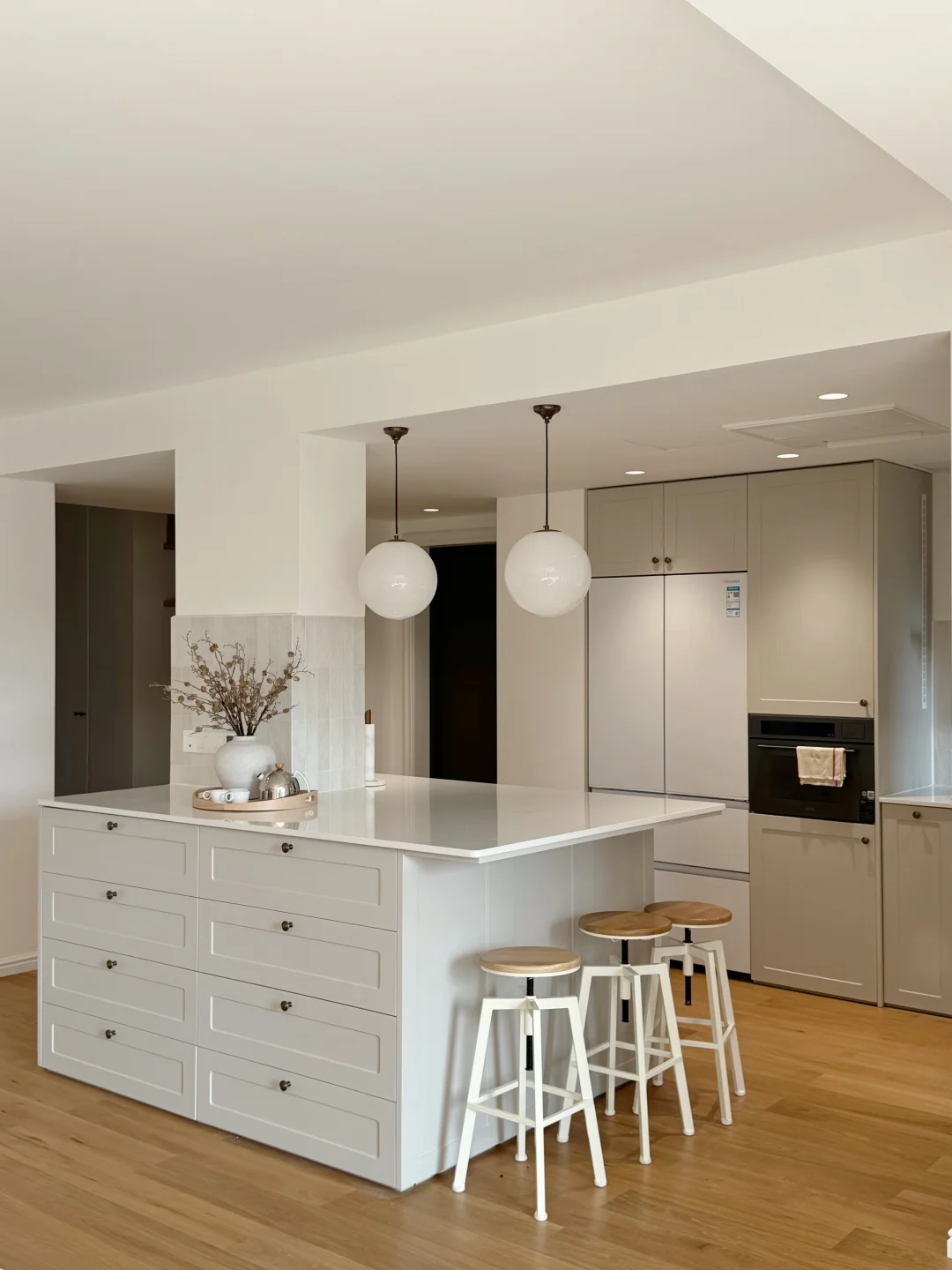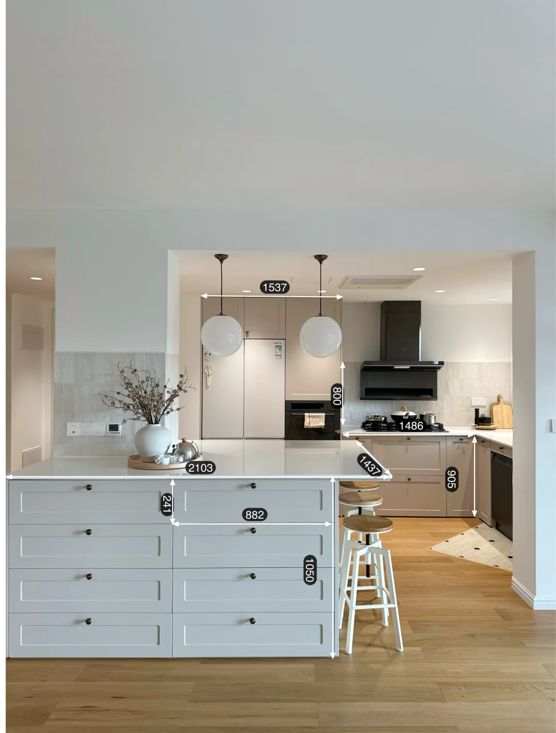 🟤用岛台代替鸡肋吊柜,能收纳又能吃饭,重点是超大操作台面,过年包个饺子超爽的~