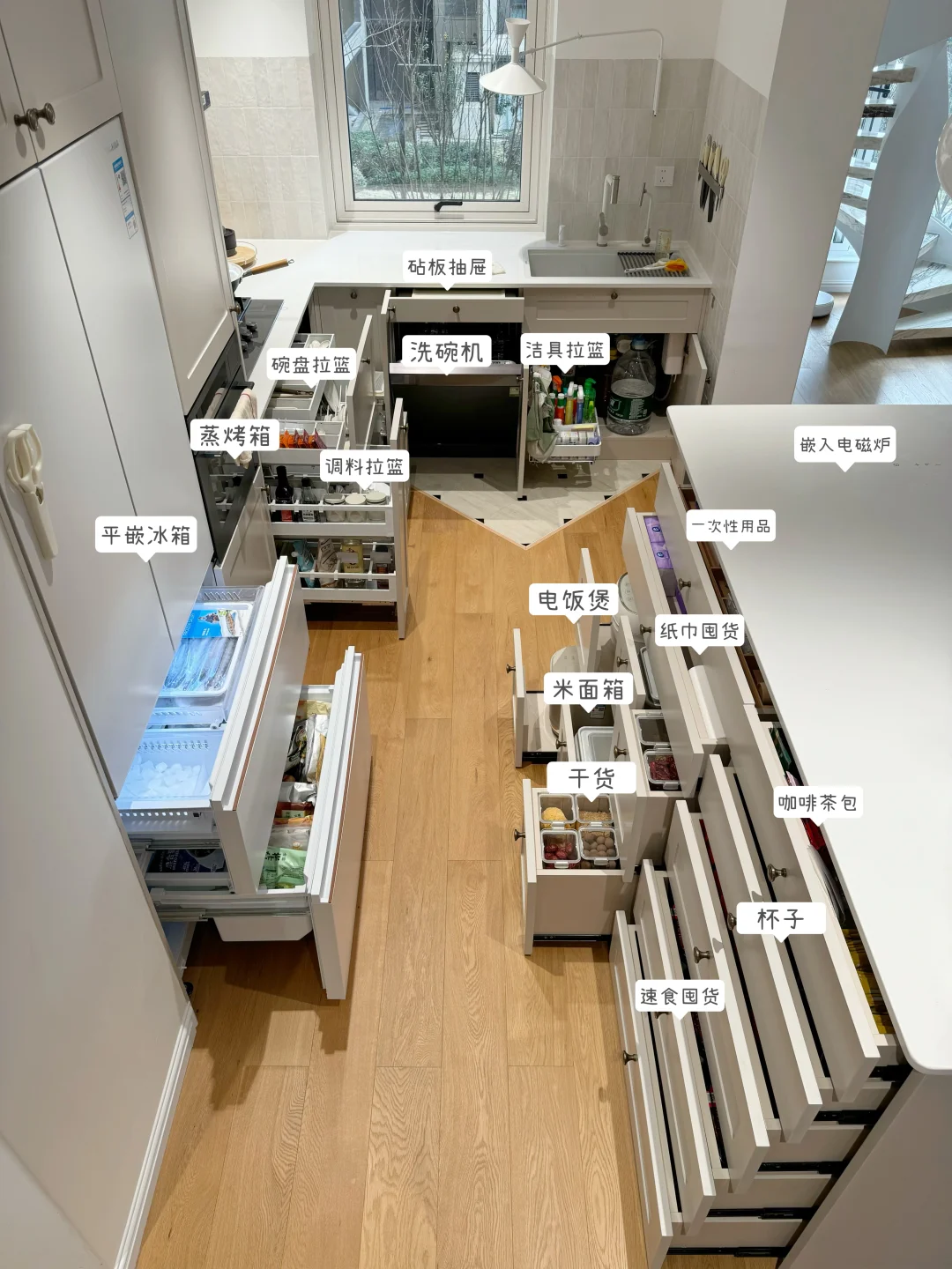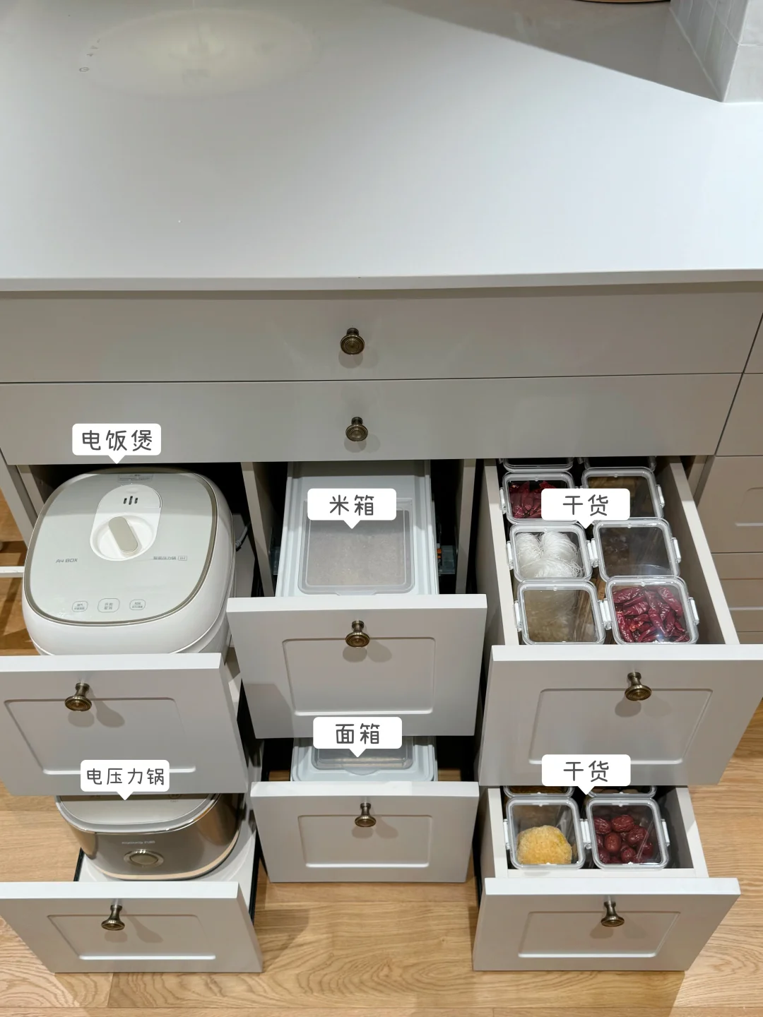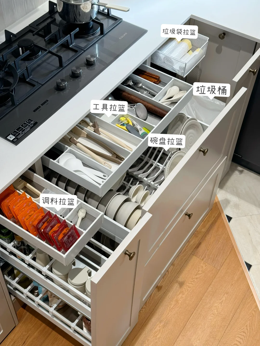 🟤橱柜内部全部做抽拉式收纳,不管是成品的拉篮,还是定制的抽屉,比起搁板拿取都更方便