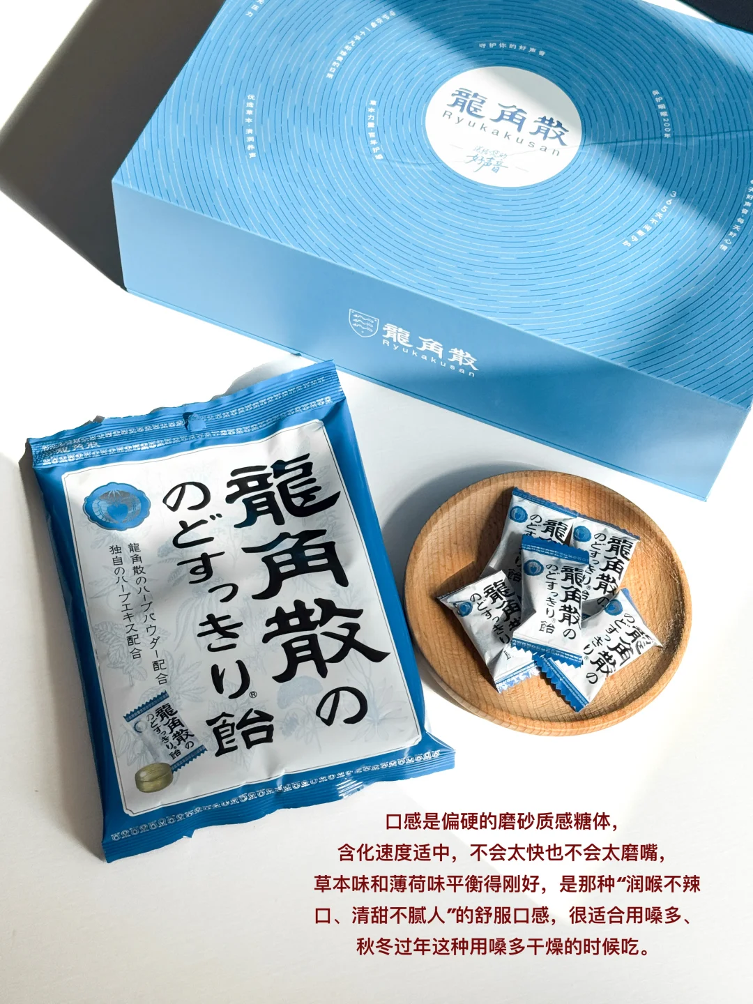 礼盒里的润喉糖都是我常回购的款!龙角散薄荷味草本润喉糖,润喉糖中有桔梗、甘草等清润护嗓的天然草本植物成分,薄荷味清凉不辣嗓、温润不齁甜,一颗嗓子清润通透~