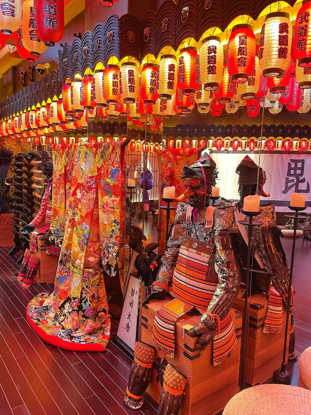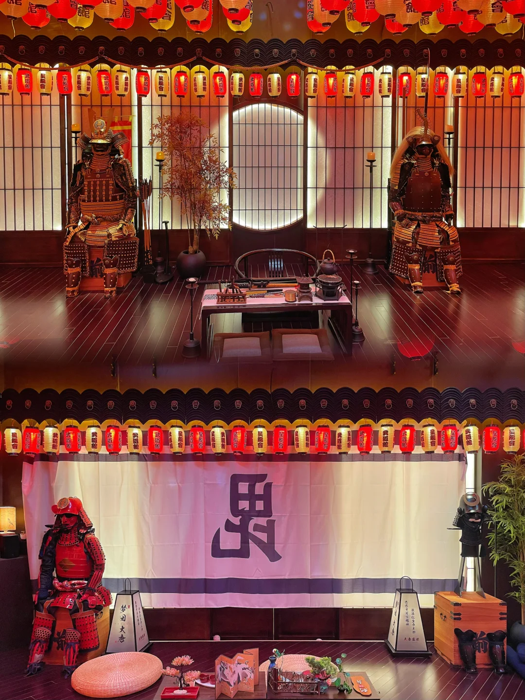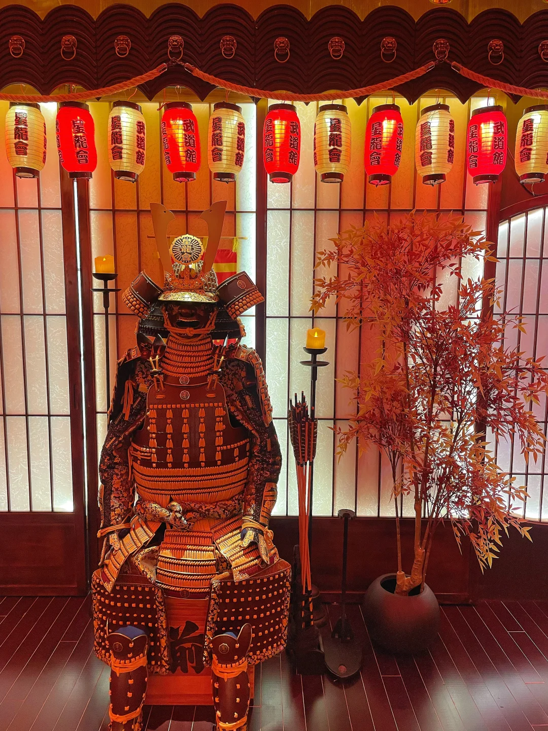 一进门就被震撼到,满墙的武士甲胄、刀剑道具,旁边还藏着一个武士馆,暗黑科技风混搭日式战国元素,氛围感直接拉满,随便站在甲胄旁拍一张,都像穿越到日本战国时代