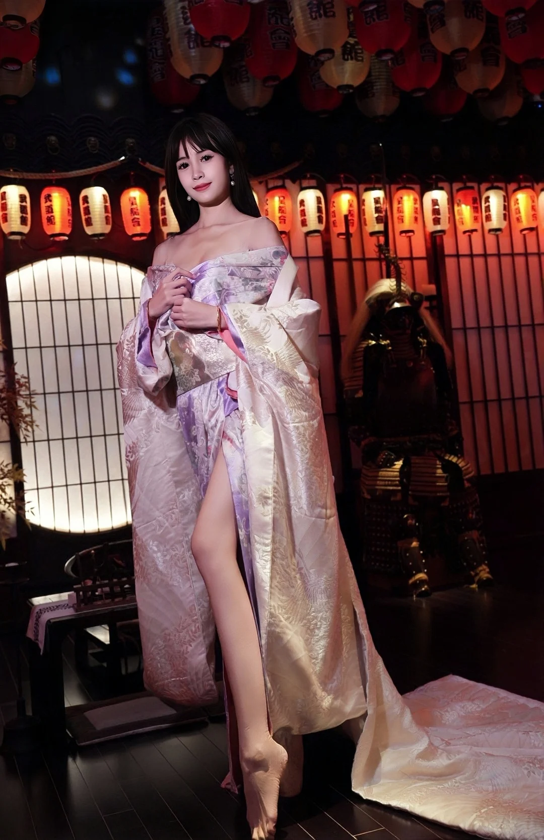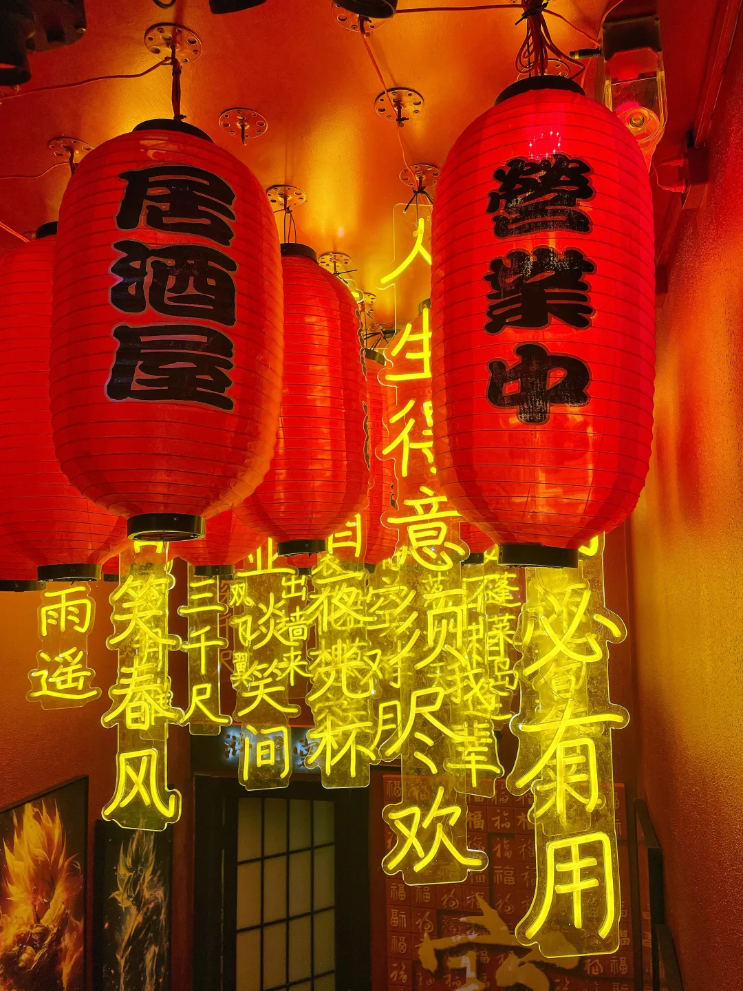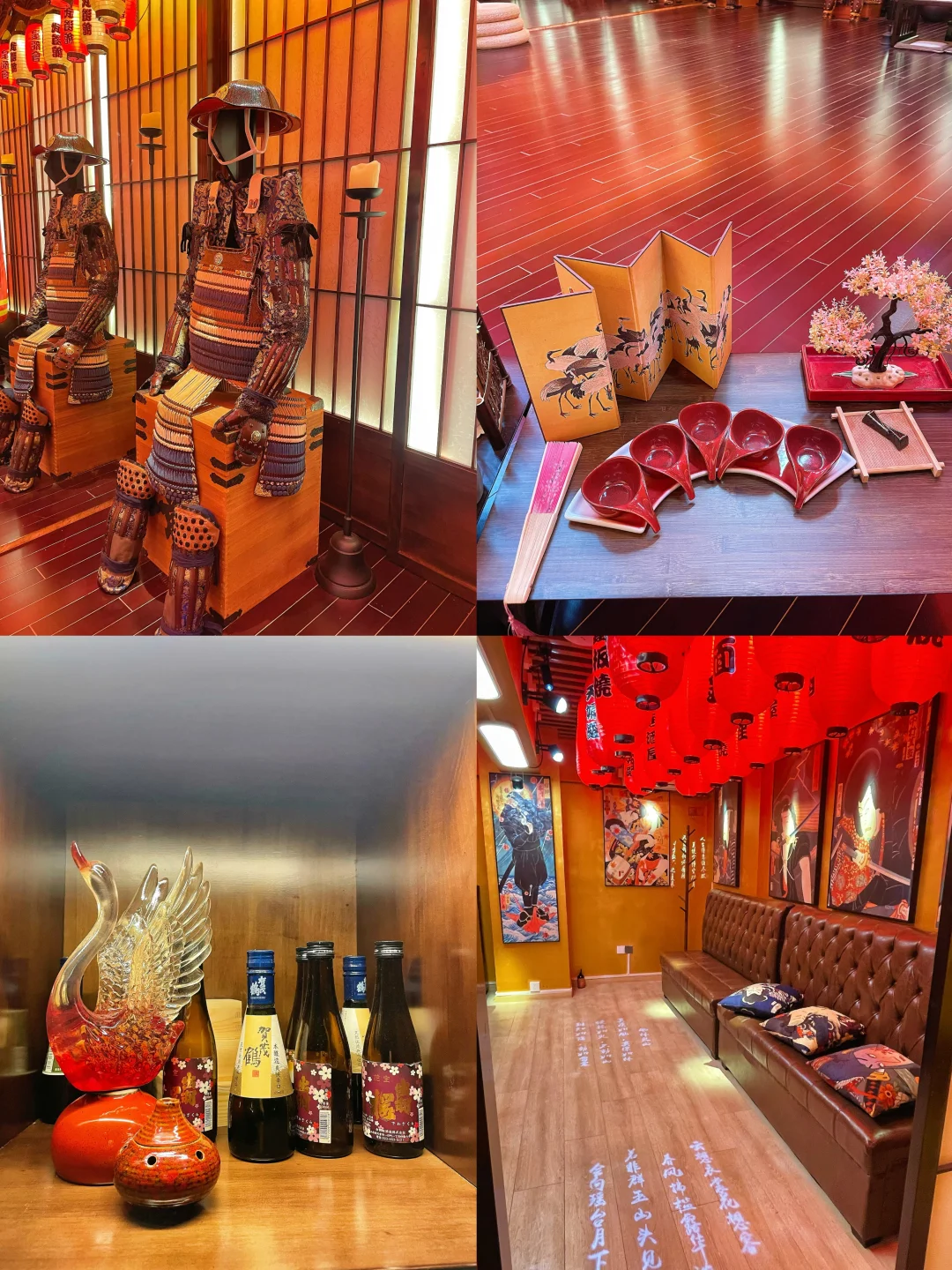 一进门就被震撼到,满墙的武士甲胄、刀剑道具,旁边还藏着一个武士馆,暗黑科技风混搭日式战国元素,氛围感直接拉满,随便站在甲胄旁拍一张,都像穿越到日本战国时代