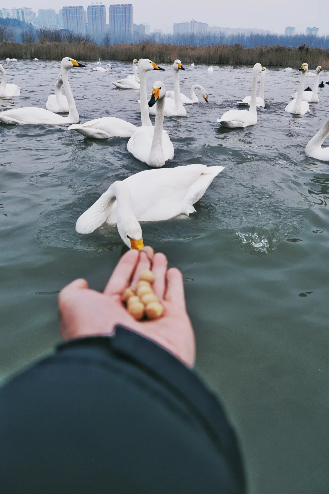 1. 岸边买袋玉米🌽,伸手就能感受天鹅柔软的喙轻啄掌心
