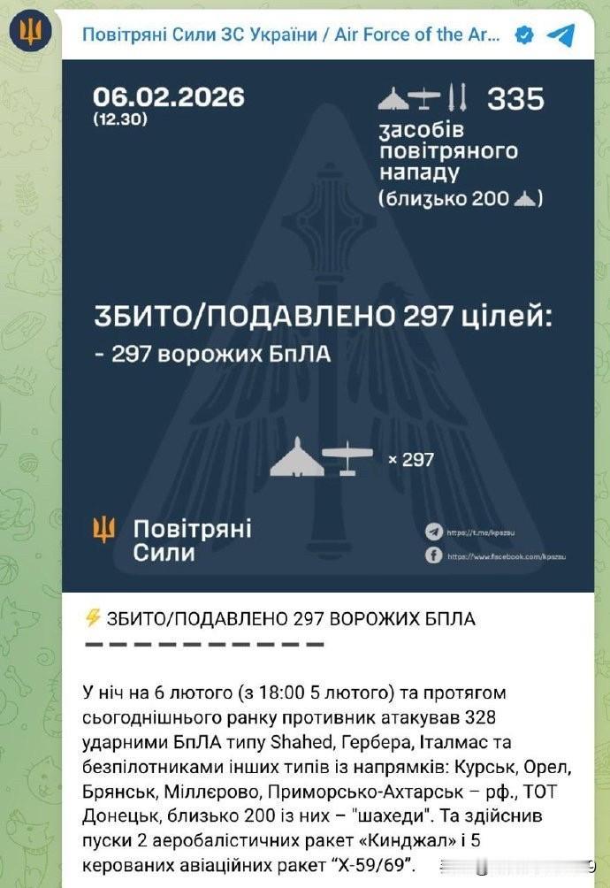 拦截率95%,乌克兰总统泽连斯基表示不满意。 乌克兰总统泽连斯基表示,他对乌克兰空军的表现表示不满。 泽连斯基认为,乌克兰空军在部分地区在抵御俄罗斯无人机方面的表现非常不好。 据乌克兰媒体报道,泽连斯基表示,他在今天召开了例行的每日会议,听取了关于首都基辅及周边地区,乌克兰第二大城市哈尔科夫州,以及波尔塔瓦州,文尼察州,第聂伯河沿岸地区、扎波罗热以及与俄罗斯接壤的边境社区和前线附近的局势报告。 泽连斯基表示,他认为乌克兰部分地区的空军表现不尽如人意。并已经与乌克兰空军司令及国防部长进行了相关讨论,此前在防空方面的相关措施必须立即实施,以更有效地击落俄罗斯的无人机。 与此同时,乌克兰空军司令部依然天天发拦截率90%~95%的防空战报。声称拦截了俄罗斯发射的无人机和导弹进行了有效拦截。 以2月5日晚乌军的防空战报为例,声称俄军发射了出动328架无人机发动袭击。 乌军防空战报称,其中约200架为“沙赫德”无人机。防空系统击落了297架无人机。 此外,俄罗斯还发射了2枚“匕首”空对地导弹和5枚“H-59/69”制导航空导弹。乌克兰空军在报告中称,这些导弹未能击中目标。 但承认,22架无人机击中了14个目标,另有2个地点出现了无人机残骸坠落的情况。 然而,在稍早些时候,据称俄罗斯对乌克兰的基洛沃格勒州的卡纳托夫空军基地发动大规模空袭,其中包含了2枚“匕首”高超声速导弹、5枚Kh-69巡航导弹和至少7架自杀式无人机。