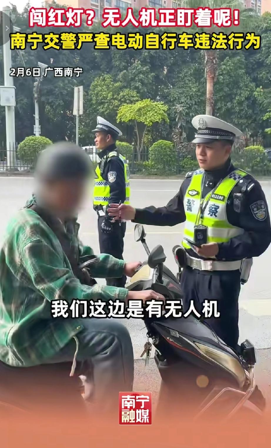 2月6号南宁交警用无人机,严查电动自行车逆行、闯红灯不戴头盔等违法行为,如果在执法过程中当事人对自己的违法行为感到疑惑,交警会用无人机拍摄的视频给当事人观看,人当事人能够更加清楚的知道因为什么违反交通。(来源于@南宁融媒)