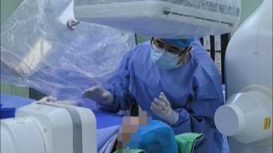 在上海四院脑血管科主任方亦斌、齐大永医生的操作下,陈先生于当日下午3点开始接受微导管溶栓治疗,医生从其颈外动脉置入头发丝粗细的微导管,直达眼动脉处注入5mgrt-PA溶栓药物。