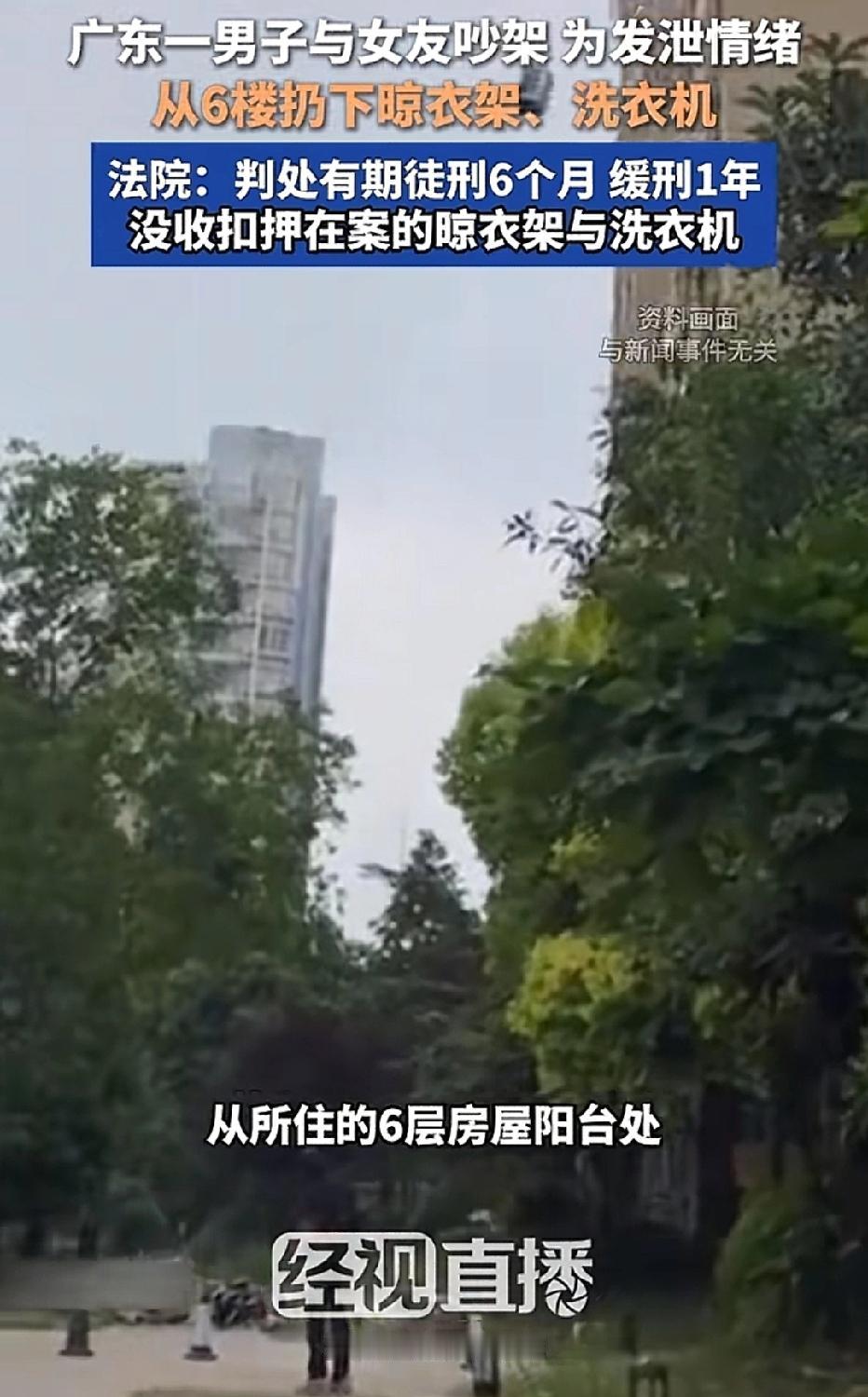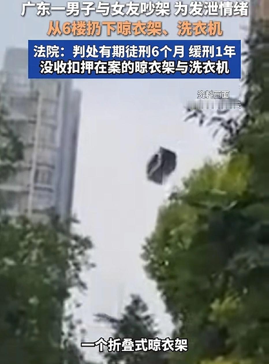广东,男子和女友吵架,他从6楼扔一个晾衣架,路过群众被吓了一跳,女友劝阻未果,男子又扔下一台洗衣机。物业报警,结果男子悲剧了。 男子蔡某酒后与女友在家中发生激烈口角,情绪失控的他为发泄心中不满,冲动之下做了后悔的事。 起初,蔡某随手拿起家中的折叠式晾衣架,他不顾女友的劝阻,径直从6楼阳台扔向楼下。 晾衣架呼啸坠落,最终砸在一楼大堂门口的人行通道上,距离一名刚好路过的群众仅一步之遥。 突如其来的坠落物让该群众惊出一身冷汗,下意识地躲闪才侥幸未受伤,但现场的惊险一幕已让周边居民纷纷侧目。 然而,第一次抛物并未让蔡某冷静下来,反而让他的过激情绪愈演愈烈。 在女友的极力阻拦下,他非但没有收手,反而变本加厉,竟将家中的洗衣机再次用力推下。 这台沉重的家用电器从6楼坠落过程中,先狠狠砸中2楼平台的边沿,发出“嘭”的一声巨响,随后反弹坠落至小区过道上,机身摔得破损变形,现场一片狼藉。 幸运的是,此次抛物未造成人员伤亡及重大财产损失,但足以让小区居民陷入恐慌。 抛物结束后,蔡某自行下楼查看现场情况。小区物业管理人员接到居民反映后迅速赶到,在确认现场情况的危险性后,当即选择报警。 蔡某并未逃离现场,而是留在原地等待民警到来。 民警抵达后,蔡某主动配合调查,如实供述了自己两次高空抛物的全部犯罪事实。 蔡某被检察院以高空抛物罪向法院提起公诉。 《民法典》第1254条 :禁止高空抛物;抛物致损由侵权人担责;难以确定侵权人的,可能加害的建筑物使用人补偿后可追偿;物业未履职的,承担相应责任;公安等机关应及时调查查清责任人。 法院经审理认为,被告人蔡某从6楼建筑物上故意抛掷晾衣架、洗衣机等物品,其中晾衣架险些砸中路人,洗衣机坠落在公共过道。 其行为已对小区公共安全造成严重威胁,属于“情节严重”情形,符合《刑法》中高空抛物罪的构成要件,公诉机关的指控成立。 同时,法院考量到蔡某犯罪后主动留在现场等待警方处理,归案后如实供述罪行,构成自首,依法可从轻处罚;其自愿认罪认罚并签署具结书,依法亦可从宽处理。 法院最终作出一审判决:判处蔡某有期徒刑六个月,缓刑一年,并处罚金人民币2000元;涉案的晾衣架与洗衣机作为作案工具,由扣押机关依法没收处理。 法律早就明确了,高空抛物不是“小事”,而是犯罪行为,不管有没有砸到人,只要危及公共安全,就会被追究责任。 希望蔡某的教训能给所有人提个醒:遇事别冲动,情绪要克制,敬畏法律、尊重他人安全,才是保护自己的最好方式。别让一时的怒火,毁掉自己一整段人生。