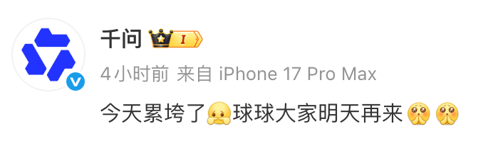 今天(2月6日)傍晚,千问在其官方微博发文:今天累垮了球球大家明天再来。
