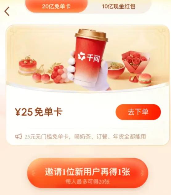 免单规则是:所有用户更新千问App后,都能白拿一张25元无门槛免单卡,不仅能免单喝奶茶,也能通过淘宝闪购买年货、点外卖。另外,邀请新朋友下载App,可各得一张25元免单卡。
