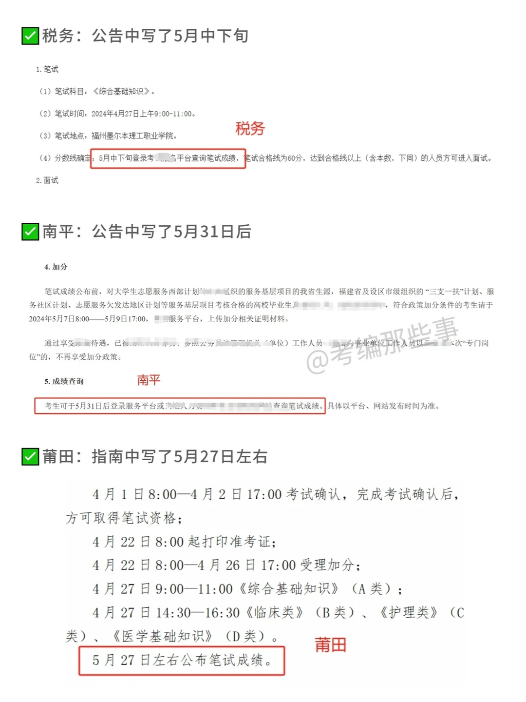 [哇R]今年427联考 福州、莆田、税务、宁德、南平、福州职业技术学院在公告中写了成绩发布时间,具体可以看上图哈(仅供参考),但不确定是否会提前