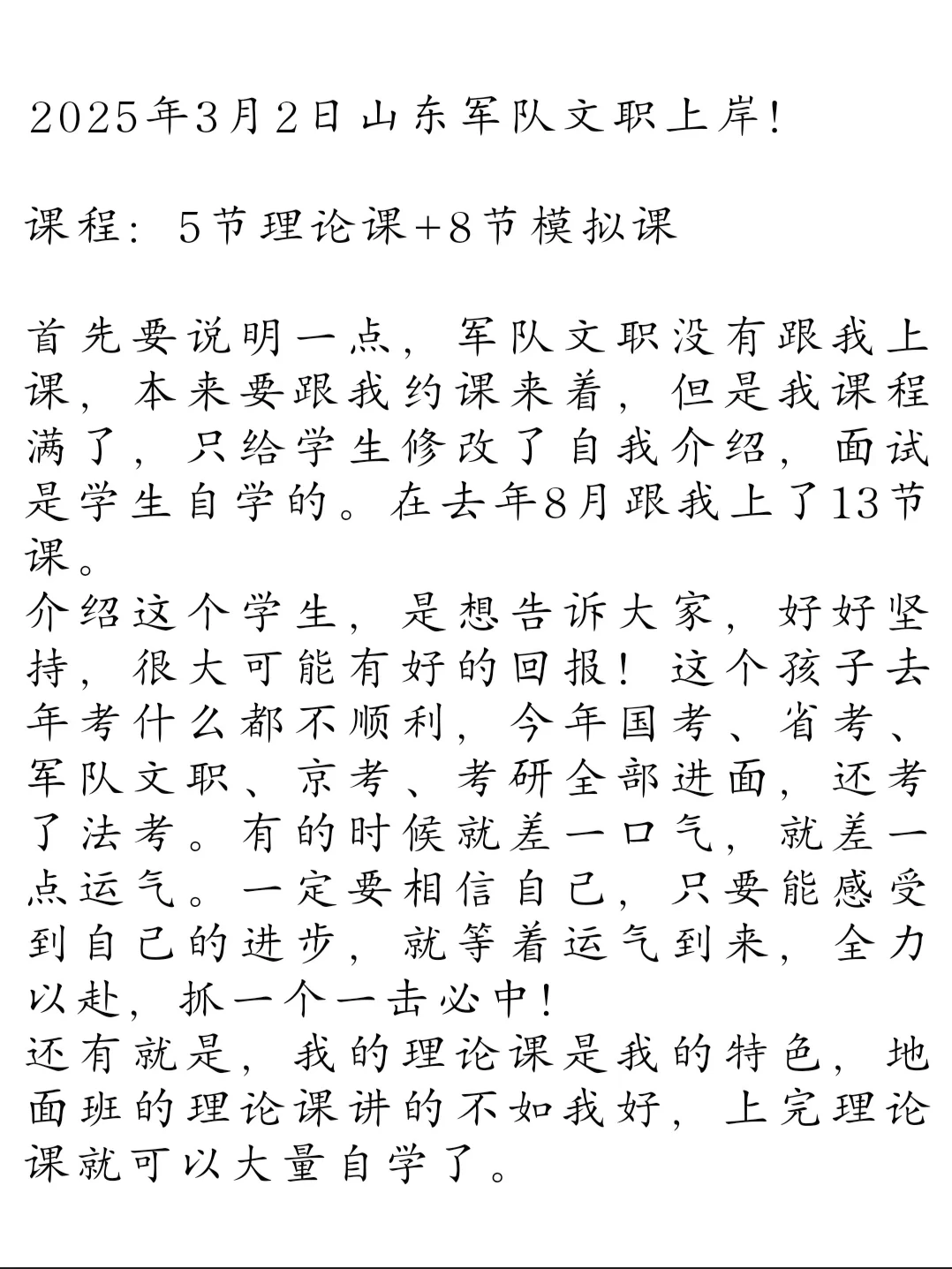 [一R]首先要说明一点,军队文职没有跟我上课,本来要跟我约课来着,但是我课程满了,只给学生修改了自我介绍,面试是学生自学的。在去年8月跟我上了13节课。