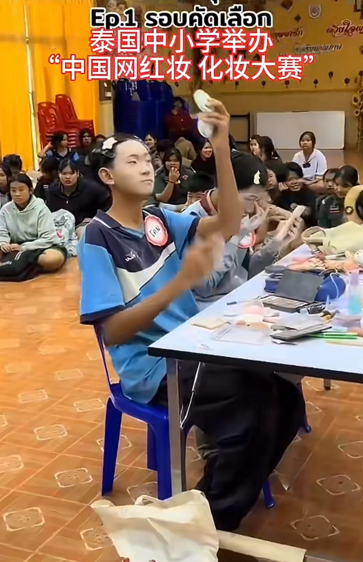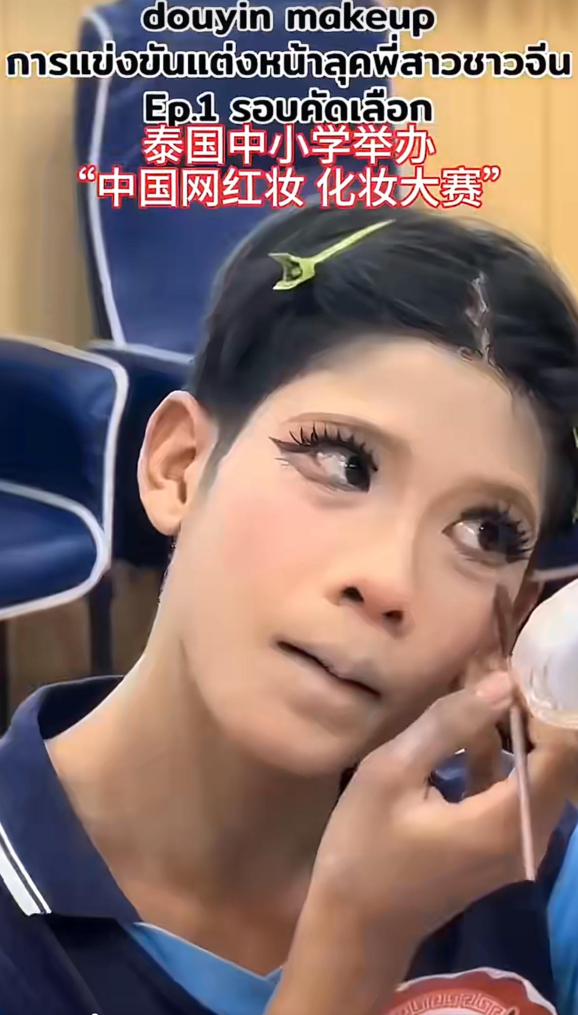 泰国中小学举办中国网红妆比赛。男女学生都可以参加,这卧蚕这假睫毛深得网红的精髓
