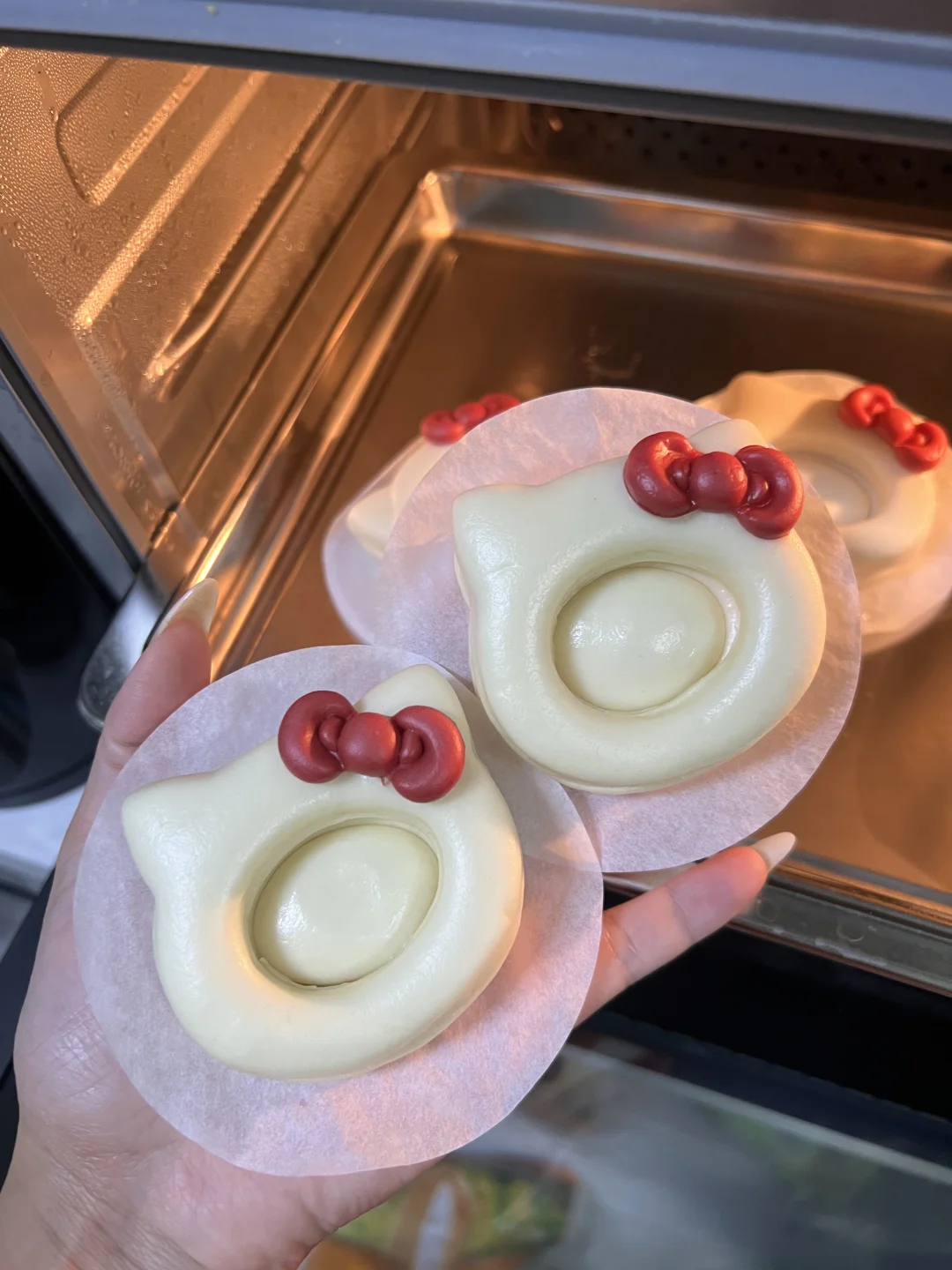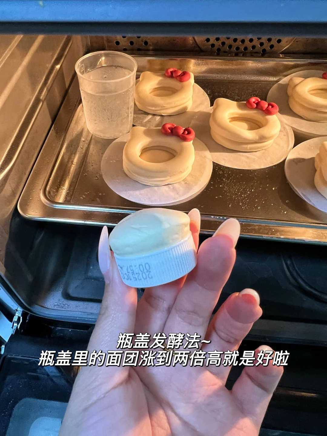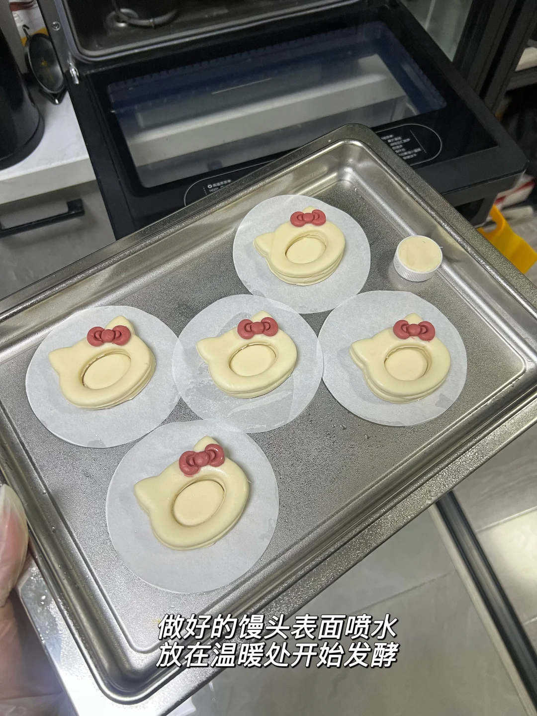 我用的一次发酵,省时省力,做好造型直接发酵,发酵到两倍大开始蒸,不太会把握发酵时间的姐妹可以参考我的瓶盖发酵法(瓶盖里装点剩余的面,跟馒头一起发酵,瓶盖的面鼓出两倍高就是好咯)