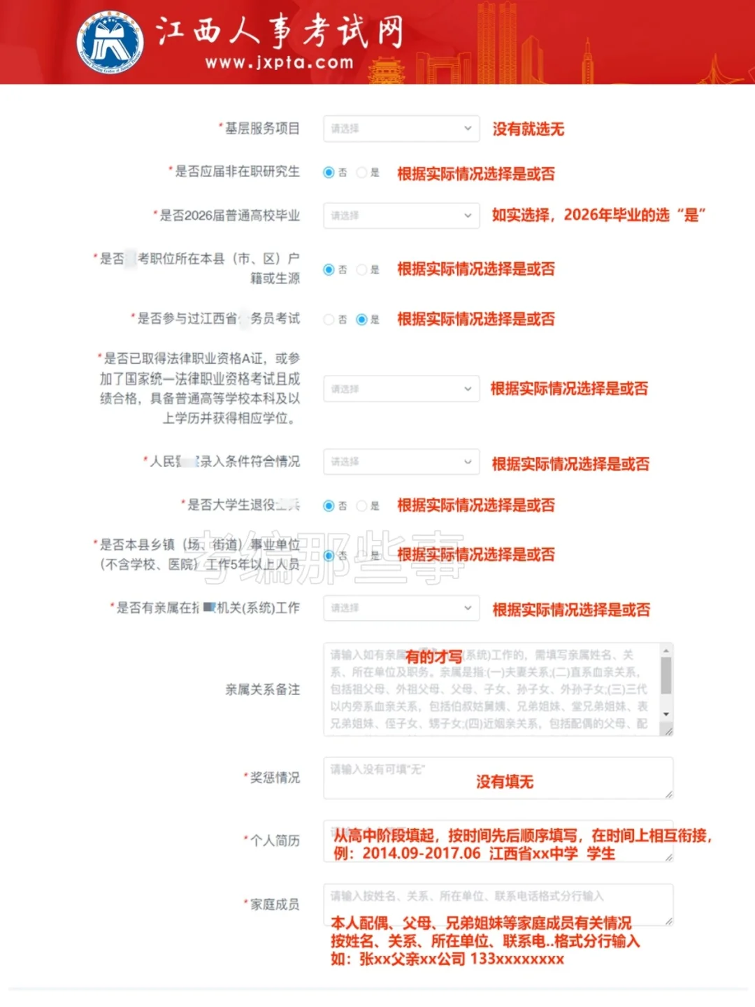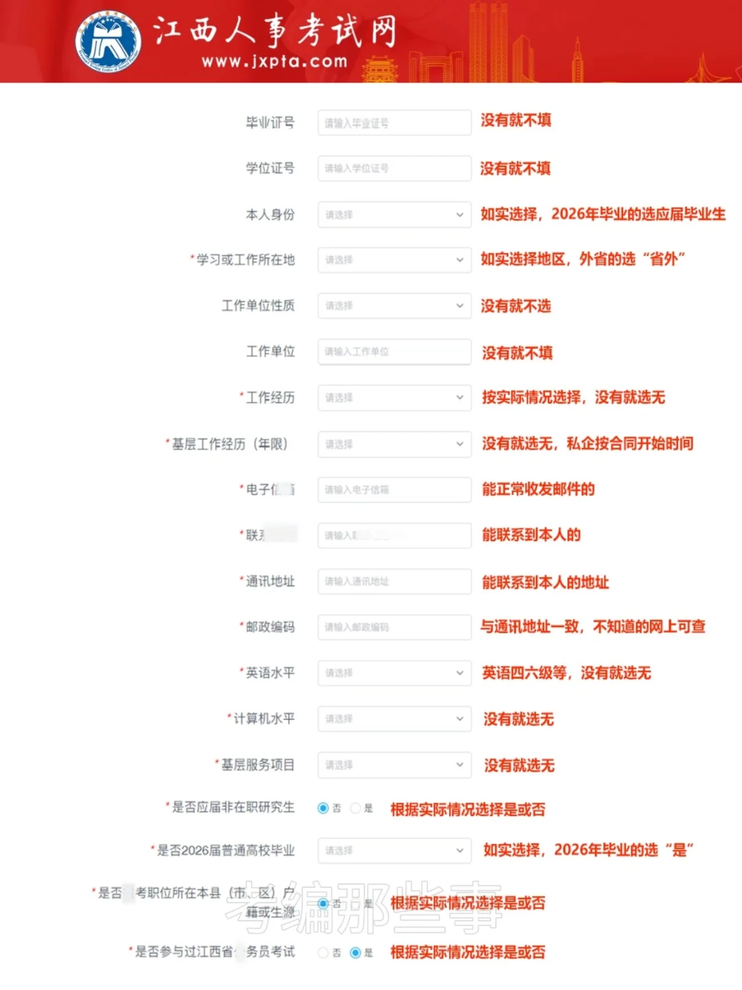 工作经历:按实际情况选择,没有就选无