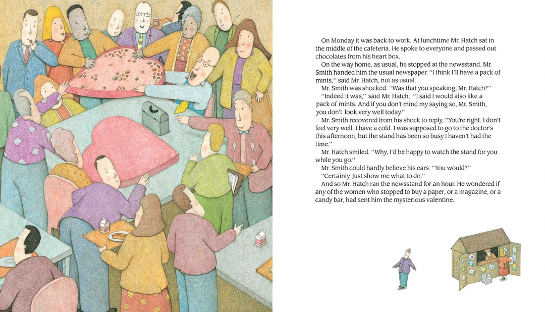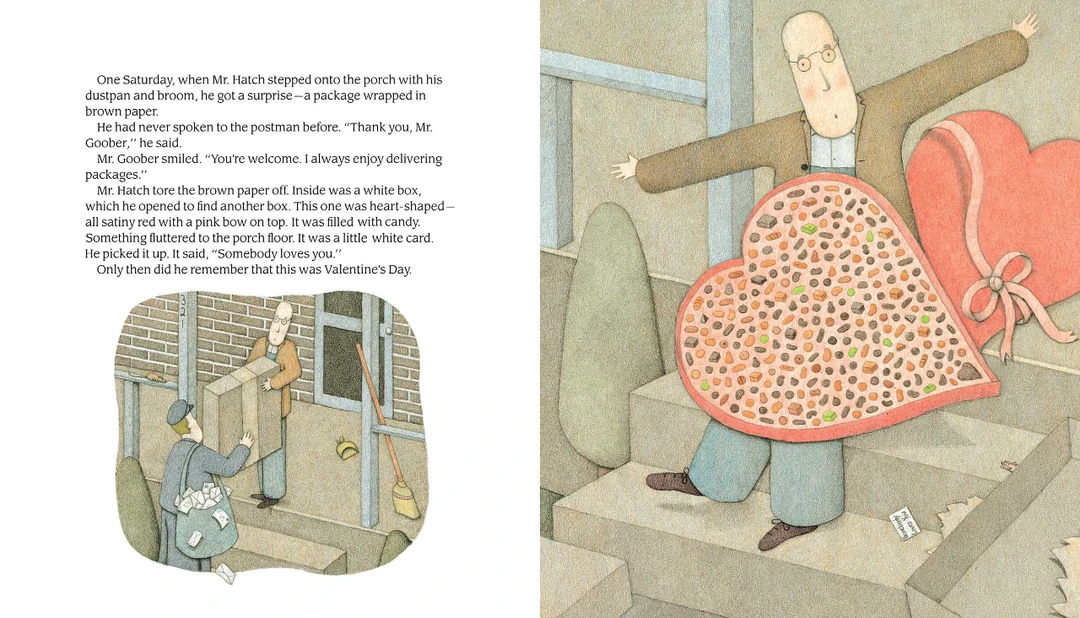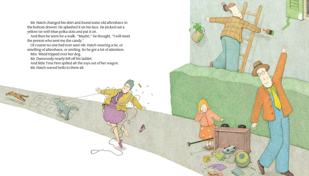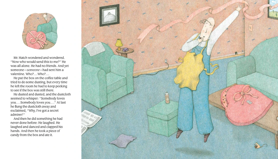 当邮递员给哈奇先生带来一盒巨大的心形巧克力和一张写着“有人爱你”的卡片时,一切都变了。哈奇先生高兴得跳了一支舞。因为他认为他可能会遇到他的秘密崇拜者,哈奇先生戴上了彩色领带和一些旧的须后水。他带着那盒巧克力去上班分享。