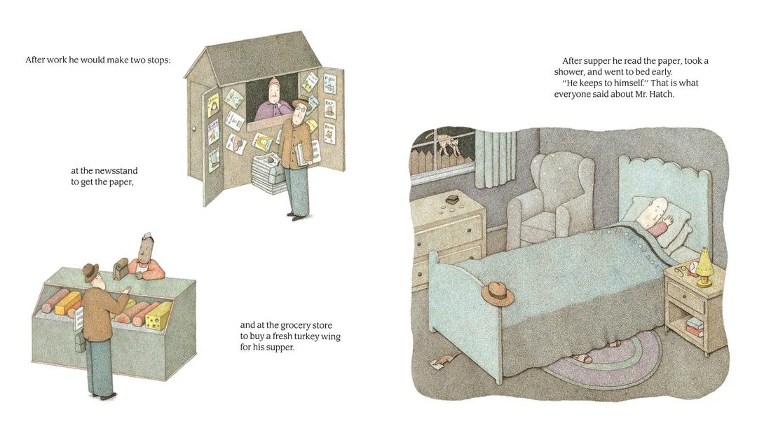 故事从描述哈奇先生孤独的日常生活开始。他一个人住,几乎不认识任何人,也不跟任何人说话,整天在鞋带厂工作,每天买一只新鲜的火鸡翅膀当晚餐,吃饭,洗澡,然后睡觉。在他的社区和工作场所,人们都对哈奇先生说同样的话,“他对自己保密。”