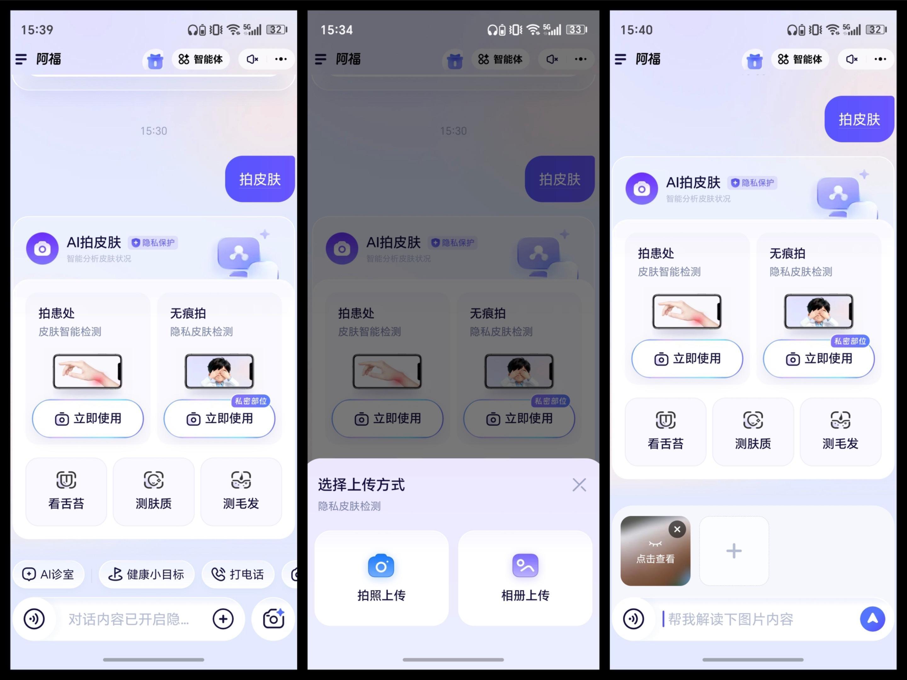 1️⃣ 诊断方式对比:问卷 VS 视觉识别以前用过的健康App大多要填一堆枯燥的问卷,而阿福的【AI智能相机】,直接拍患病部位就能识别问题,这种“所见即所得”的诊断效率,比对着镜子瞎猜或者上网盲搜靠谱太多✅