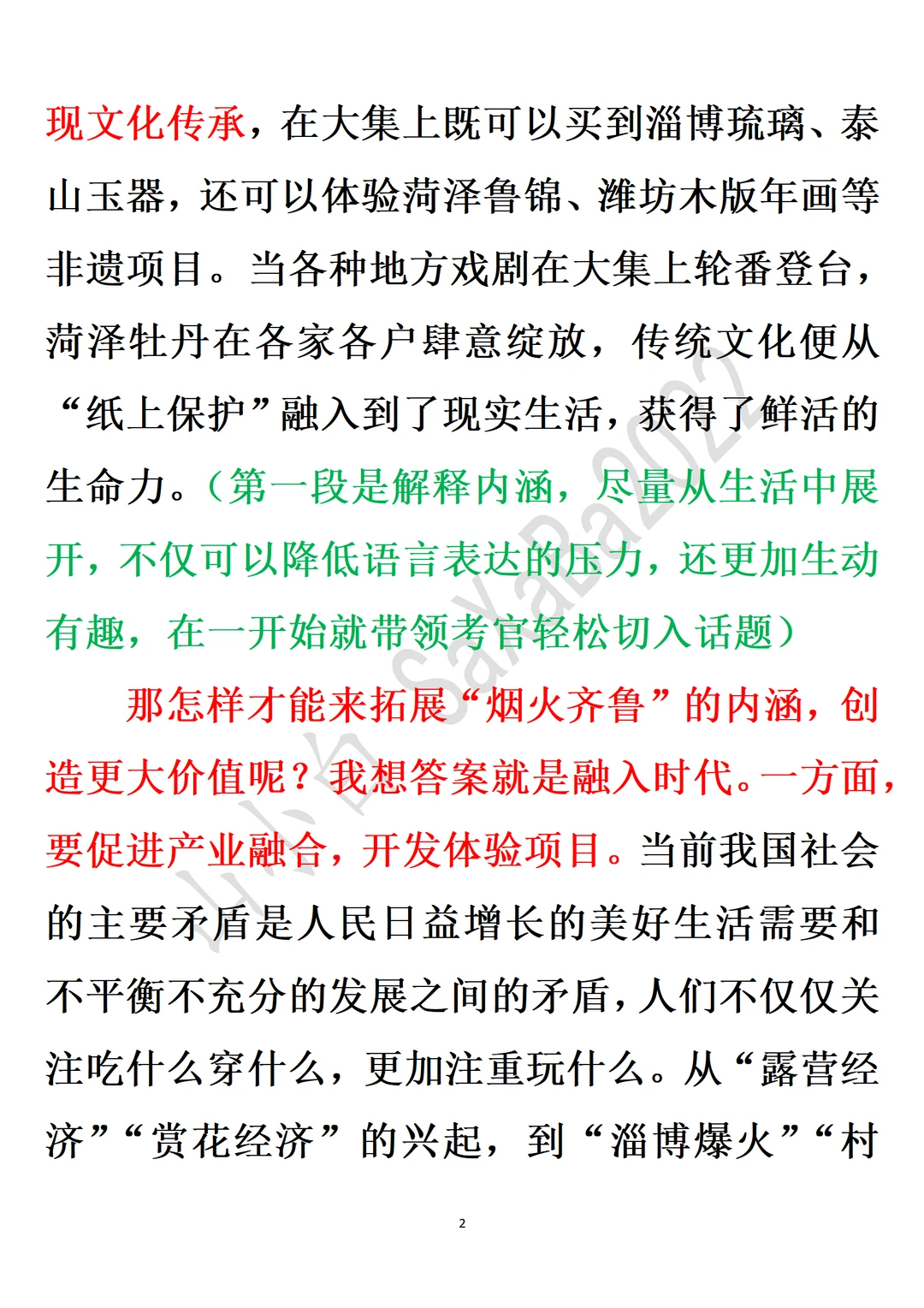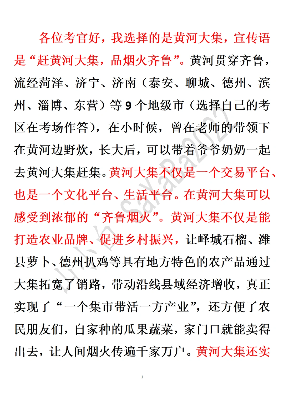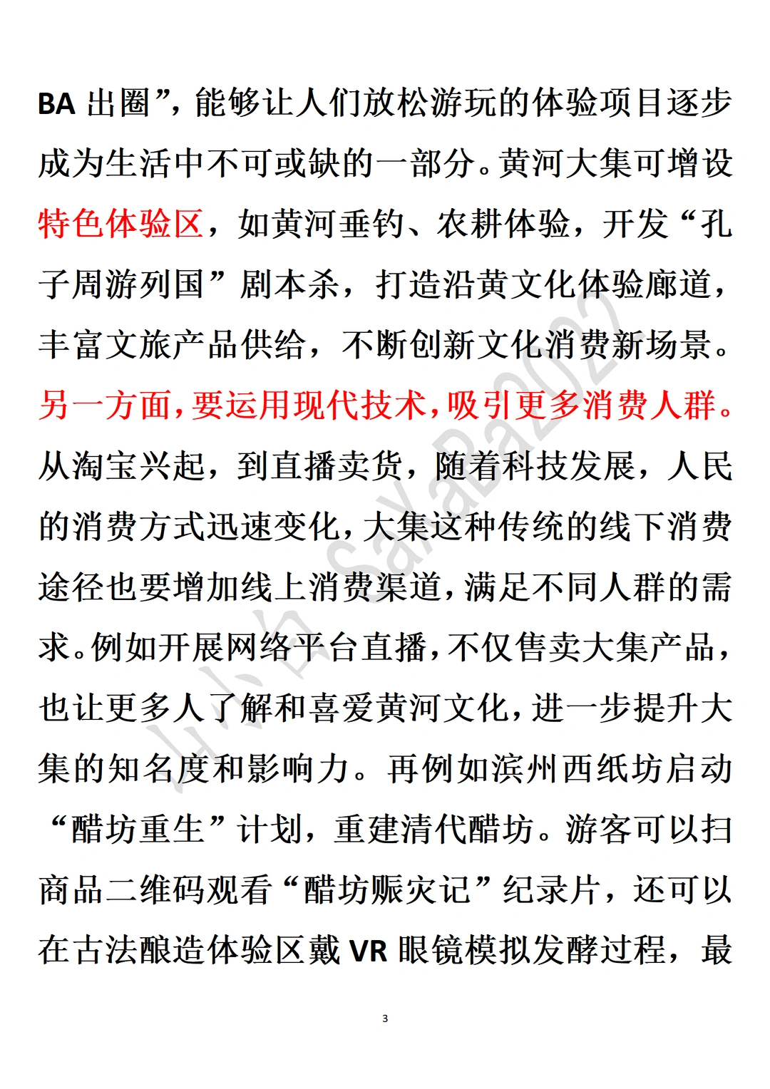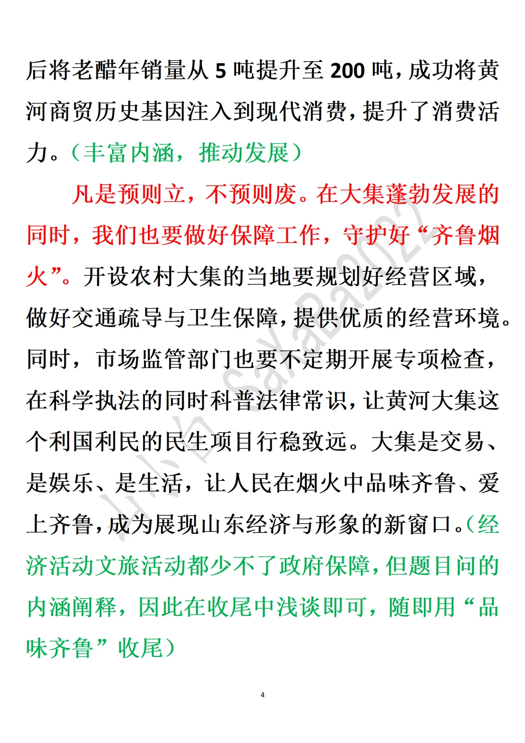 [二R]这个题问的是阐释大集的内涵,那内涵就是“是什么”,我们要从这一个小点出发完成整体作答。因此我的处理是三段式,第一段从生活场景入手,从过去到未来,从经济到文化,从消费到民生,都产生了积极作用。第二段是为了未来的发展,文化的传承,消费的振兴,我们要进一步丰富内涵。第三段就浅谈如何保障大集的健康发展,守护内涵,进行结尾。