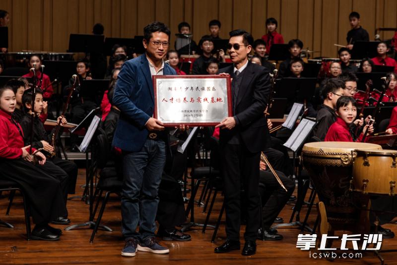音乐会现场,湖南省民族管弦乐学会授予乐团“湖南青少年民族器乐人才培养与实践基地”牌匾,并邀请学会会长杨向东担任乐团艺术顾问。演出在《龙腾虎跃》中达到高潮,在艺术顾问杨向东的激情指挥下,由湖南师大附中博才实验中学打击乐声部领奏,湖南青少年民族乐团与常德市中小学民族乐团齐力共鸣,锣鼓激昂,气势磅礴。最终,音乐会在《花好月圆》的温馨旋律中圆满落幕。