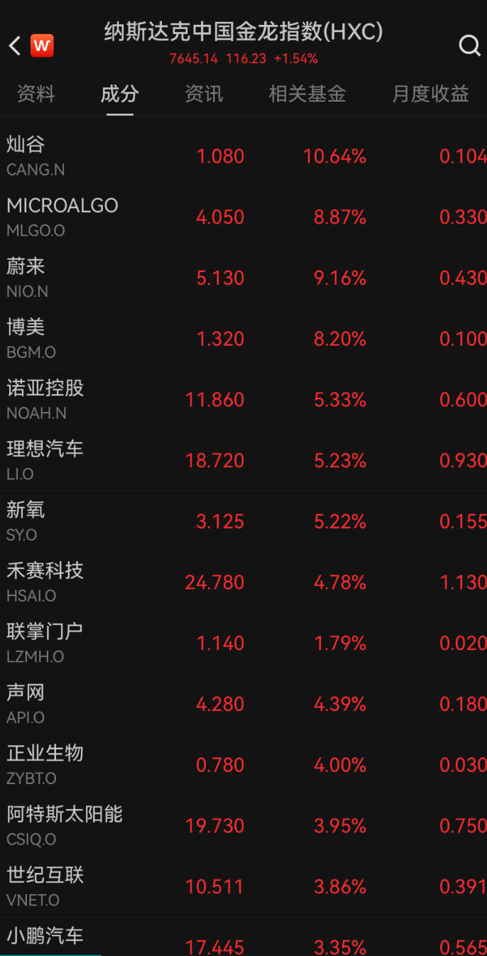 纳斯达克中国金龙指数涨1.5%。热门中概股多数上涨,截至发稿,蔚来大涨9%,理想汽车涨5%,小鹏汽车涨3%,百度集团涨2%,阿里巴巴涨1.67%。