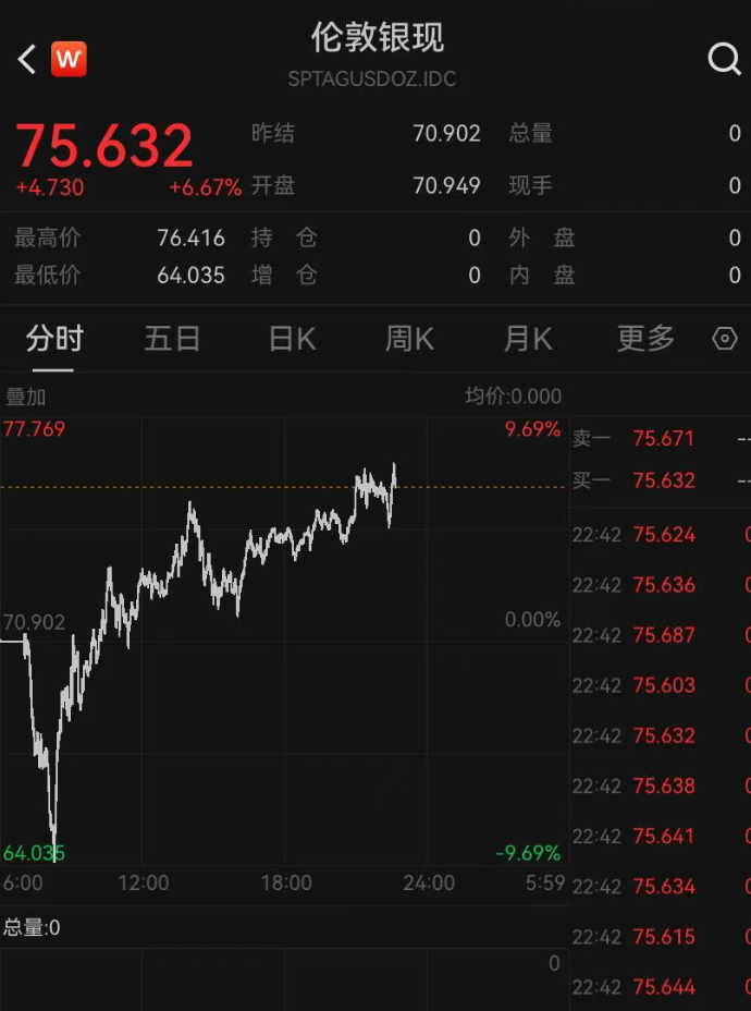 贵金属方面,现货黄金涨超3%,目前报4928美元/盎司;现货白银一度大涨突破76美元,目前涨幅收窄至6.6%,报75.6美元/盎司。