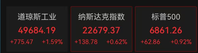 2月6日晚,美股三大指数集体高开高走,截至发稿,道指涨775点,涨幅1.59%;纳指涨0.62%;标普500指数涨0.92%。