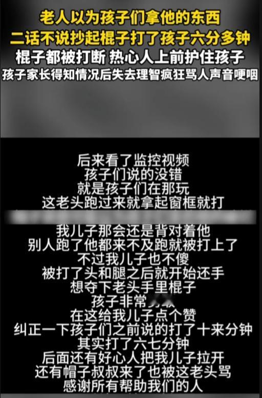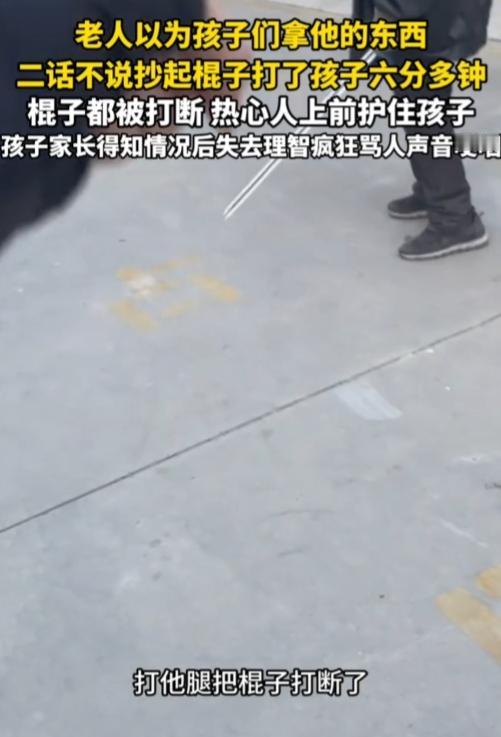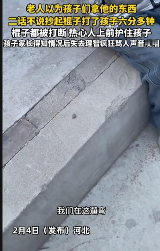 河北,一老人以为孩子们拿他东西,二话不说拿起棍子打了孩子头和腿持续六分多钟,棍子都被打断了,幸得热心人上前护住小孩。 孩子家长得知情况后失去理智疯狂骂人,声音哽咽。最后选择报警了,帽子来了也被老人骂了。 太可怕了!一句他以为,就可以不听解释,直接抄家伙就对准孩子头打,还持续六分多钟,棍子都被打断,这是打算往死里打啊!倚老卖老,帽子也敢骂! 真是坏人变老了,这种是骨子里的坏!太可恶!必须严惩,从法律层面来看,老人的行为已经涉嫌故意伤害,必须要为自己的所作所为付出应有的代价。不能因为他年纪大了,就对他的恶劣行为姑息纵容。 而孩子家长在得知情况后情绪失控骂人,虽然行为有些过激,但也完全可以理解。自己的孩子平白无故遭受如此大的伤害,哪个家长能保持冷静呢?他们的愤怒和痛苦是真实的,也是对孩子深深的爱。 希望相关部门能够尽快处理好这件事,给孩子和家长一个公正的交代,让这样的悲剧不再发生。