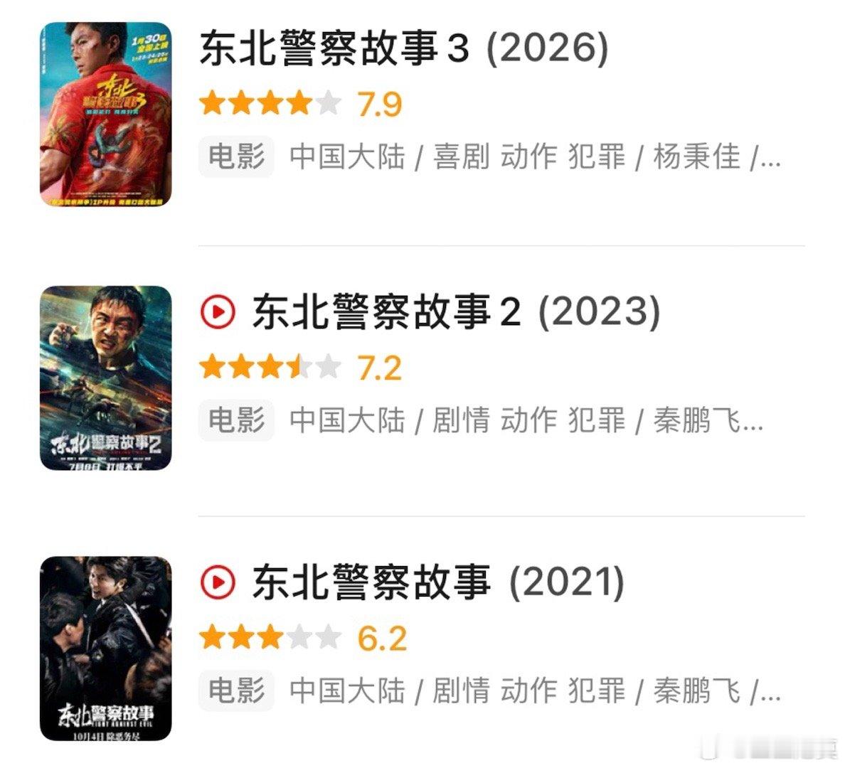 东北警察故事3豆瓣开分7.9 《东北警察故事3》豆瓣开分7.9。比前两部好太多。目前票房1300多万。前两部都是网大,没有上大银幕。这个系列的主演是谢苗,曾经是童星,和李连杰合作过《新少林五祖》《给爸爸的信》。当时就很能打,有一种英雄出少年的感觉。现在更能打,能扛起一部动作电影的男主角了。谢苗功夫底子好,可惜没有资本捧,也没有巨星捧,只能自己一步一步打出来。
