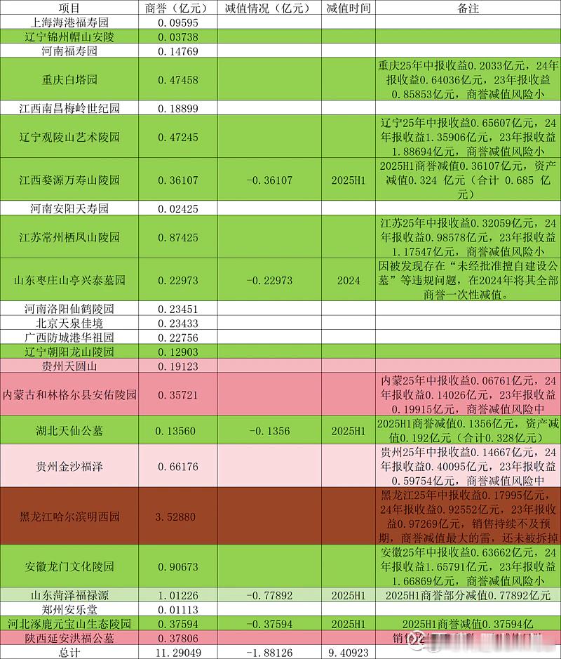 表中已全额减值标的多是经营出现明确问题项目:山东枣庄山亭兴泰墓园因 “未经批准擅自建设公墓” 合规问题,2024 年被一次性减值 0.22973 亿;江西婺源万寿山陵园、湖北天仙公墓则因收益持续下滑,在 2025 年上半年完成全额减值;河北涿鹿元宝山生态陵园同期全额减 0.37594 亿。这些标的的风险已集中释放,反而让剩余商誉的结构更清晰。