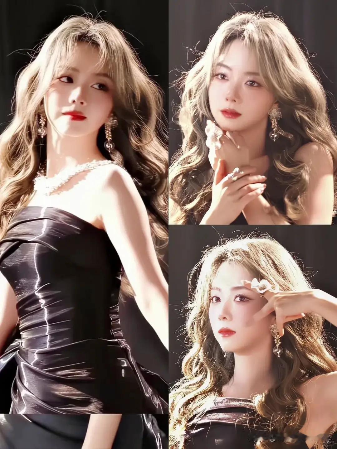 一袭黑色的抹胸裙,显得很酷、飒,搭配一头黄色波浪长发,配上一张笑意盈盈的娃娃脸,