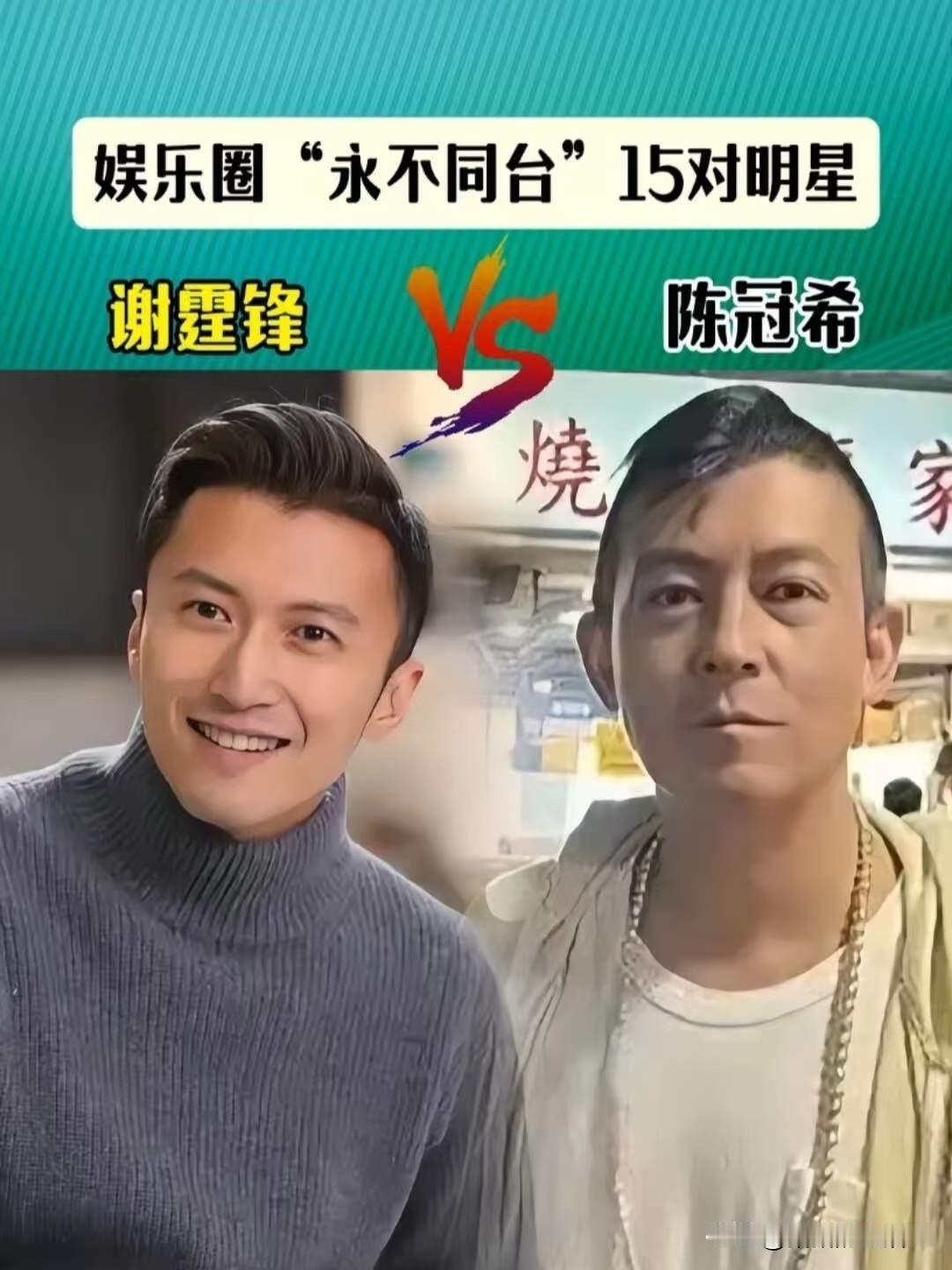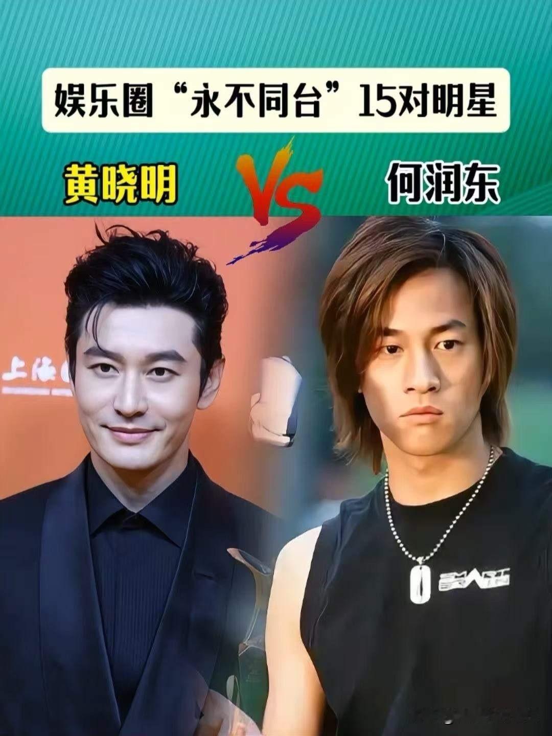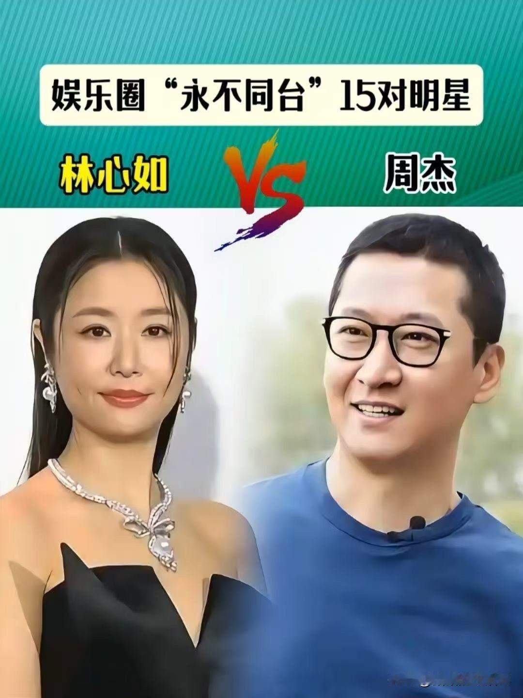 李湘秦海璐永不同台。 林志玲孙红雷永不同台。 贾静雯林心如永不同台。 高圆圆袁泉永不同台。 林心如周杰永不同台。 演艺圈打拼出来真的挺不容易的,尤其是这些一线和超一线大明星,更是每天面对镁光灯,一举一动都备受关注。 所以,他们每一个人都很自律,尽量让自己做到优秀,有的甚至为了保持身材,每天吃饭还要计算热量,真是非常自律。 圈内人也少不了一起演绎或者出席活动,不过这15对明星,竟然会永不同台。里面有的是因为情感纠葛,不过都是大明星,都很体面。