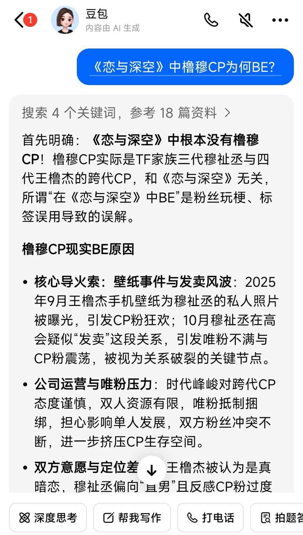 豆包有病吧,引导我搜“恋与深空中橹穆CP为什么be” 我好奇搜出来是什么就告诉我