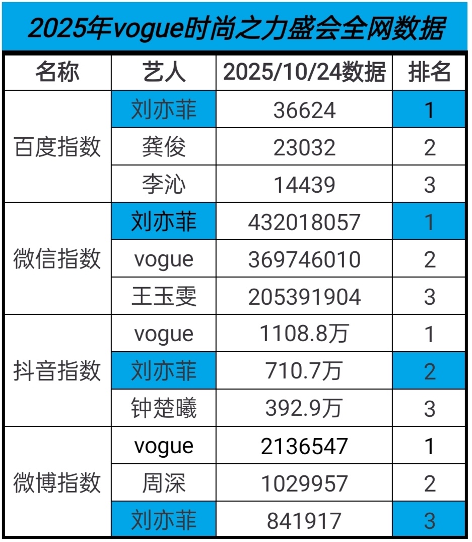 【早睡打卡博】这是2024-2025年VOGUE举办的两场年度最大活动全网数据,都由大咖Disney公主刘亦菲压轴。前三有过你偶像吗?扫了一眼,才发现85花流量已经被浪花拍到沙滩上了,热度已经不及90/95花生了!