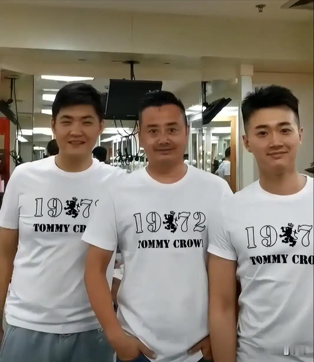 闫学晶和儿子林傲霏、小叔子闫光明穿同款灰卫衣站一排合影,168的闫光明被182的