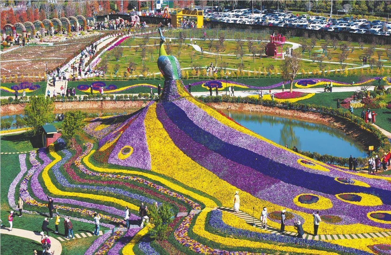 春节临近,坐落于昆明市呈贡区斗南滇池湿地公园旁的七彩花海公园2月5日正式对外开放,公园围绕巨型孔雀花雕打造十大特色景观区域,成为滇池沿岸供市民游客赏花休闲的新去处。图为2月6日,游客在昆明七彩花海公园参观游览。